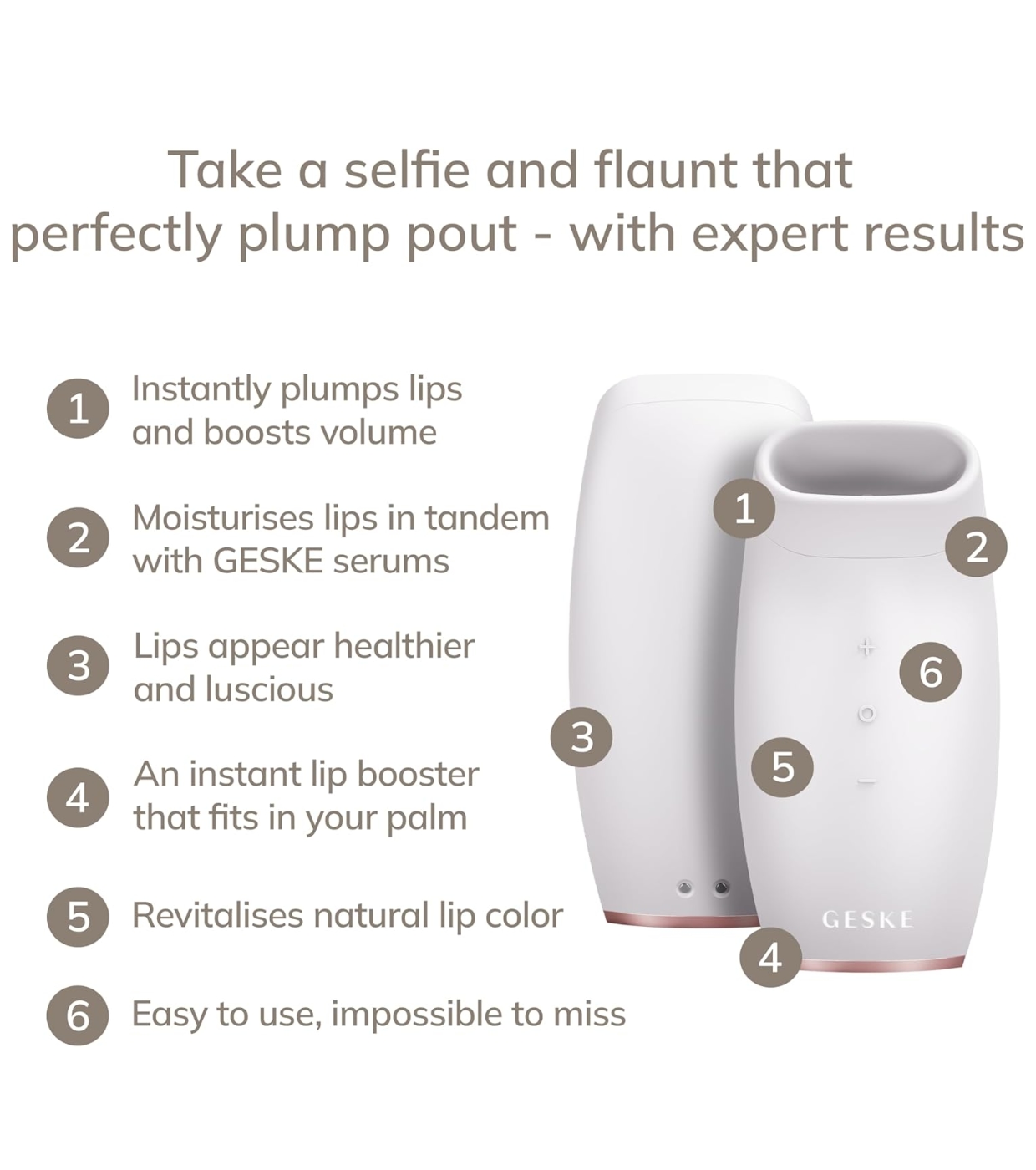 The Lip Volumizer & Booster device from Geske is a state-of-the-art beauty device designed to keep lips fuller, more defined and youthful-looking day after day.