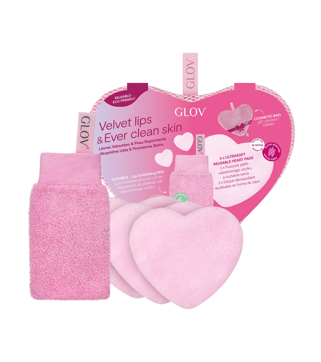But that is not all. This set also includes three ultra-soft heart-shaped cosmetic pads. These patented and reusable pads allow you to easily reach all the corners and folds of your face. Use alone with water or your favorite cleansing products to enjoy clearer, more radiant skin with GLOV®.