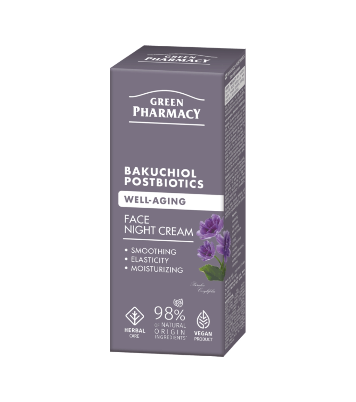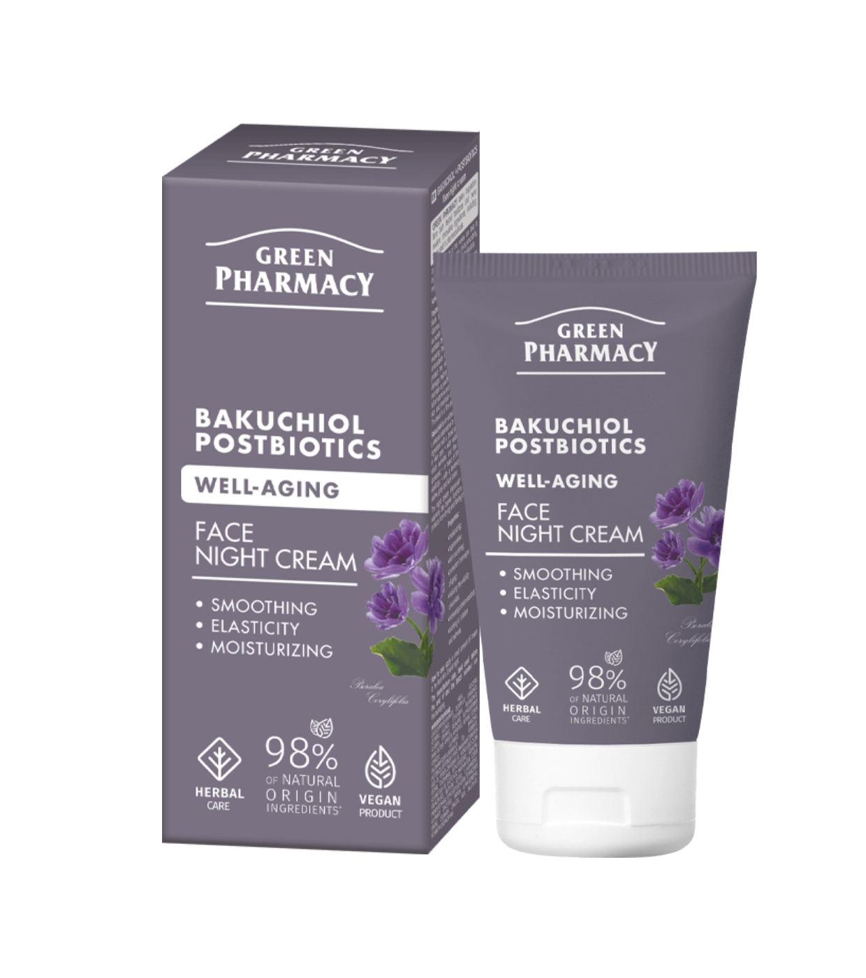Green Pharmacy Anti-Aging Night Face Cream with Backuchiol and Postbiotics has been designed to provide deep hydration and reinforce the skin's protective barrier overnight.