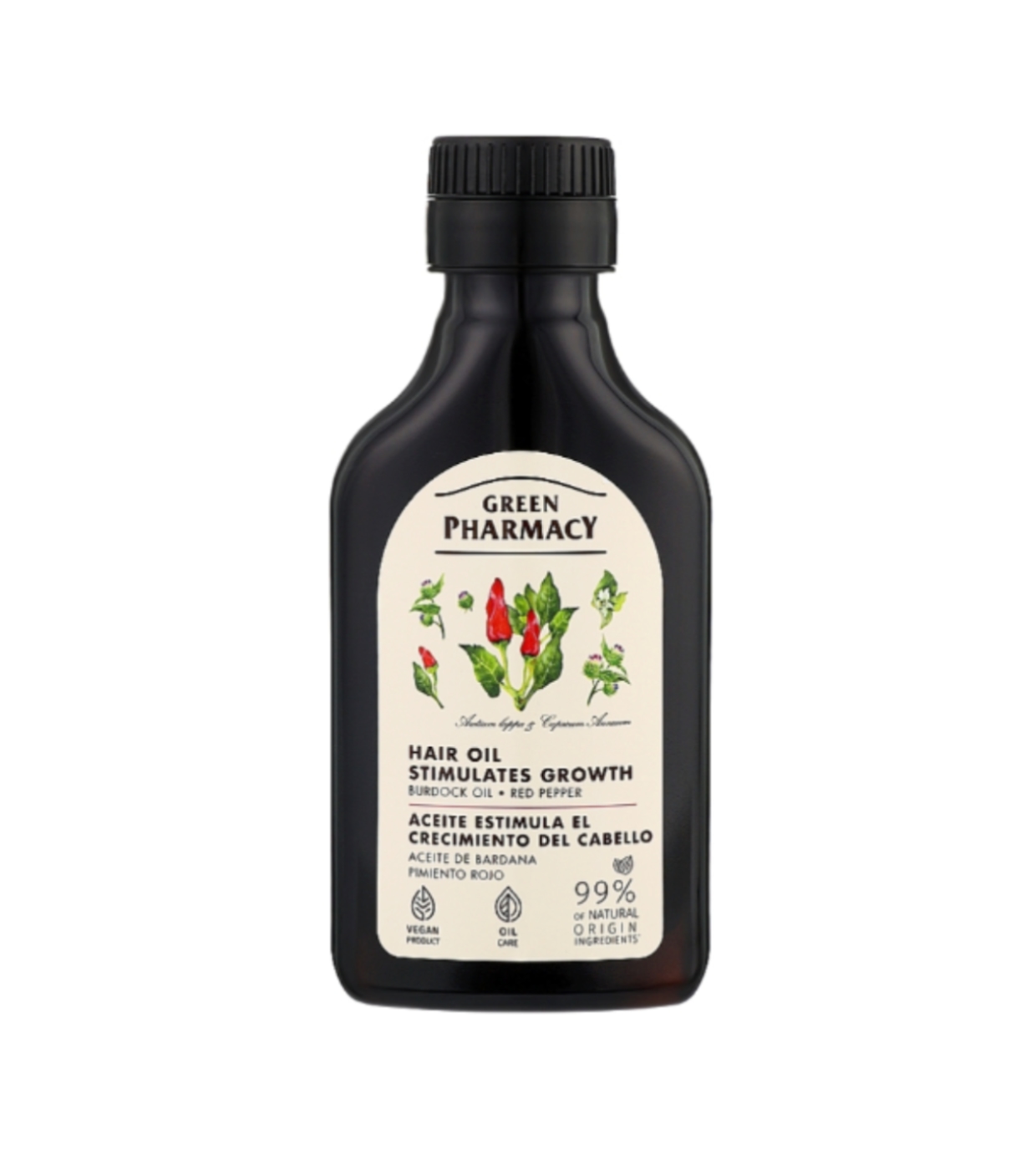 Hair stimulating oil with red pepper and burdock from Green Pharmacy .