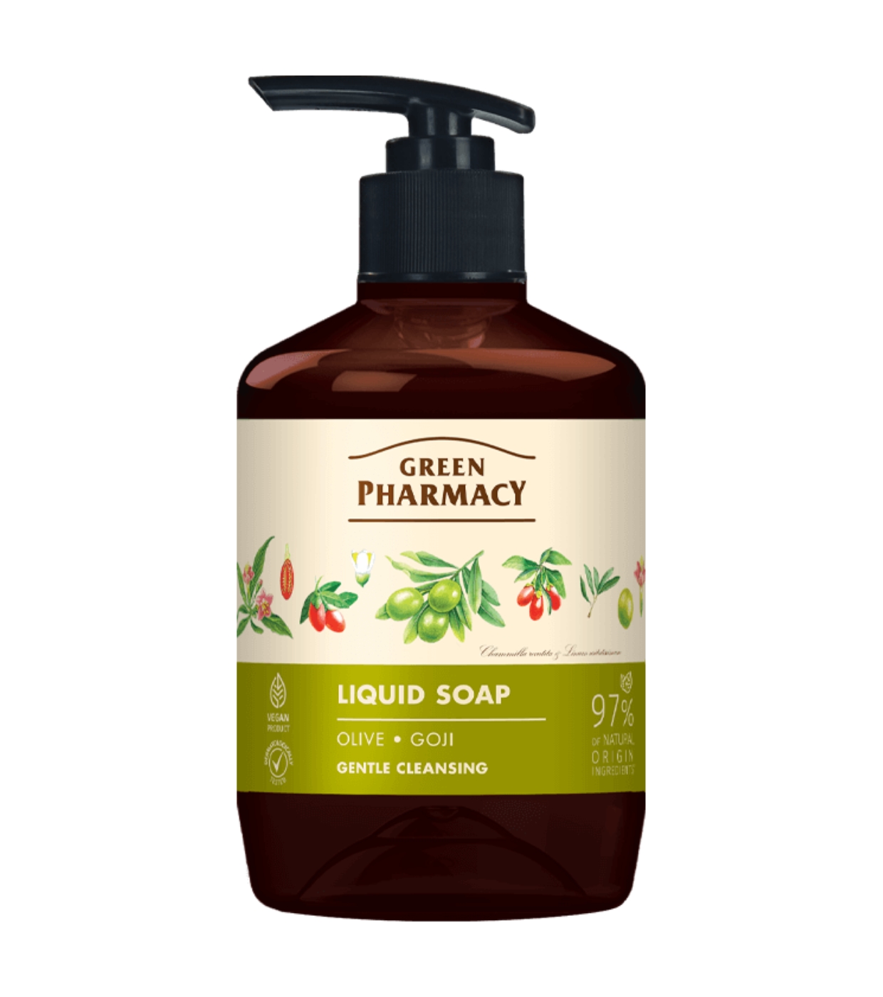 Green Pharmacy Liquid Hand Soap with Olives and Goji Berry offers gentle and effective cleansing, respecting the skin's natural balance.