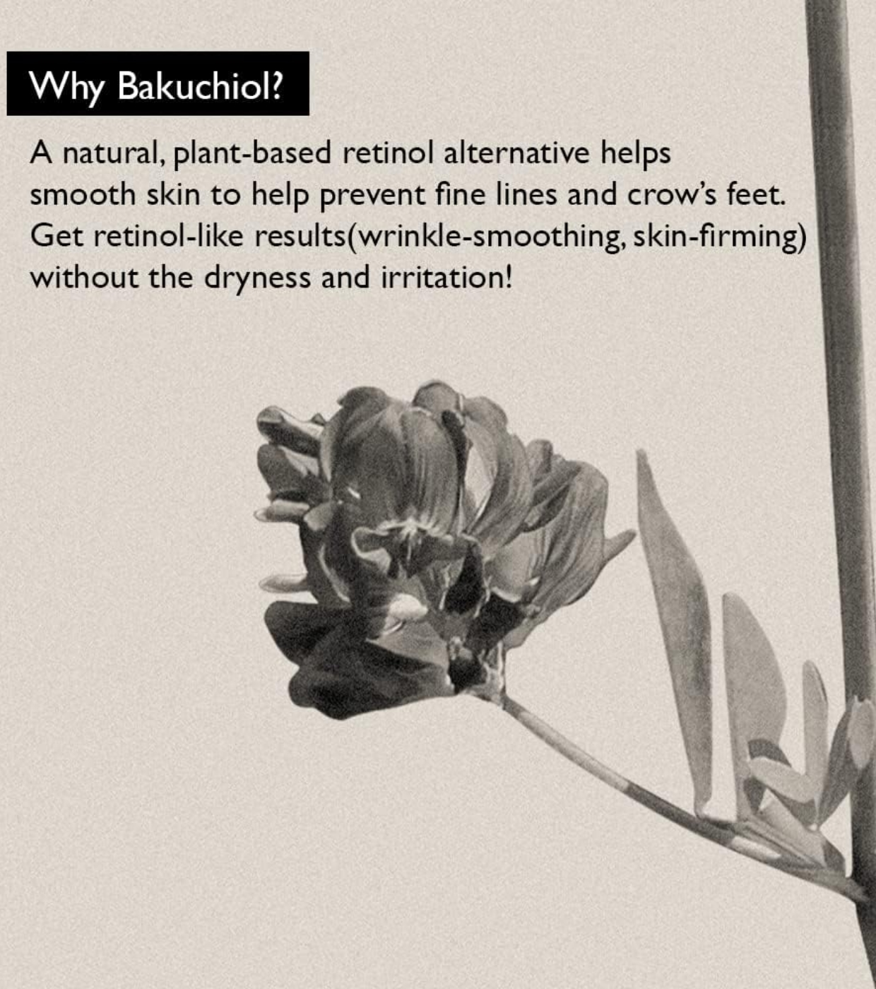 - Bakuchiol: Firms, improves elasticity and visibly reduces wrinkles without irritating sensitive skin.