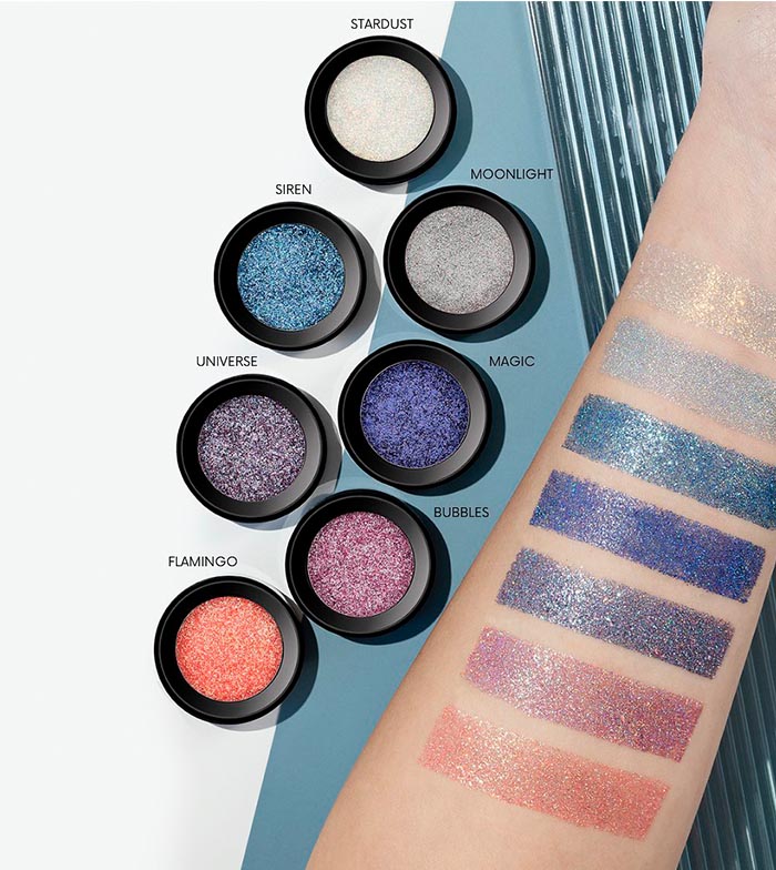 Shimmering eyeshadows with intense pigmentation and gorgeous hues to create a dramatic, iridescent look.