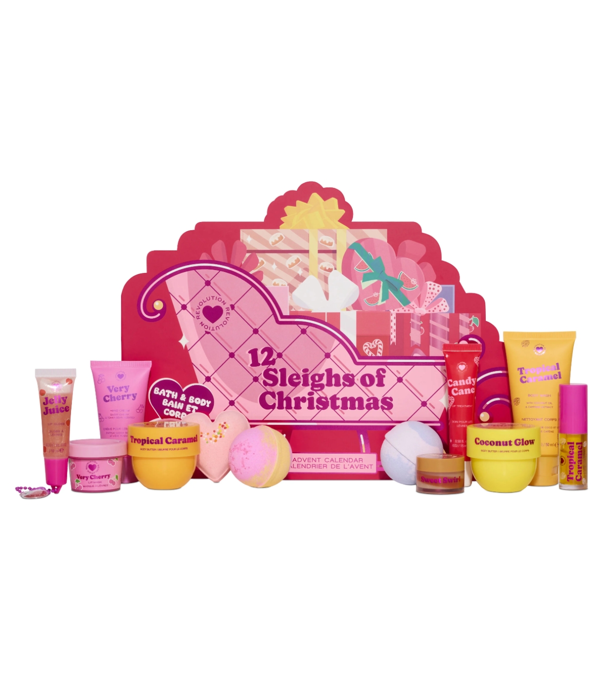 I HEART REVOLUTION TROPICAL CARAMEL BODY WASH (INGREDIENTS): AQUA (WATER, EAU), AMMONIUM LAURYL SULFATE, COCAMIDE MEA, GLYCOL DISTEARATE, HYDROXYETHYLCELLULOSE, PHENOXYETHANOL, PARFUM (FRAGRANCE), COCAMIDOPROPYL BETAINE, PEG-150 DISTEARATE, DISODIUM EDTA, ETHYLHEXYLGLYCERIN, SODIUM CHLORIDE, COCOS NUCIFERA (COCONUT) OIL, CAFFEINE, CYCLODEXTRIN, CITRIC ACID, CI 15510 (ORANGE 4), CI 19140 (YELLOW 5), CI 42090 (BLUE 1), CI 17200 (RED 33), BENZYL SALICYLATE. I HEART REVOLUTION COCONUT GLOW BODY BUTTER (INGREDIENTS): AQUA (WATER, EAU), CAPRYLIC/CAPRIC TRIGLYCERIDE, CETEARYL ALCOHOL, GLYCERIN, HELIANTHUS ANNUUS (SUNFLOWER) SEED OIL, BUTYROSPERMUM PARKII (SHEA) BUTTER, PALMITIC ACID, PEG-100 STEARATE, STEARIC ACID, PARFUM (FRAGRANCE), GLYCERYL STEARATE, PHENOXYETHANOL, ACRYLATES COPOLYMER, TRIETHANOLAMINE, POLYSORBATE 60, CARBOMER, CETEARETH-25, SYNTHETIC FLUORPHLOGOPITE, ETHYLHEXYLGLYCERIN, DISODIUM EDTA, SILICA, MACADAMIA TERNIFOLIA (MACADAMIA) SEED OIL, EUTERPE OLERACEA (ACAI) FRUIT OIL, COCOS NUCIFERA (COCONUT) OIL, TRIETHOXYCAPRYLYLSILANE, TIN OXIDE, BENZYL SALICYLATE, GERANIOL, LIMONENE, LINALOOL, CI 77891 (TITANIUM DIOXIDE), CI 19140 (YELLOW 5), CI 14700 (RED 4). I HEART REVOLUTION TROPICAL CARAMEL BODY BUTTER (INGREDIENTS): AQUA (WATER, EAU), CAPRYLIC/CAPRIC TRIGLYCERIDE, CETEARYL ALCOHOL,GLYCERIN, HELIANTHUS ANNUUS (SUNFLOWER) SEED OIL, BUTYROSPERMUM PARKII (SHEA) BUTTER, PALMITIC ACID, PEG-100 STEARATE, STEARIC ACID, PARFUM (FRAGRANCE), GLYCERYL STEARATE, PHENOXYETHANOL, ACRYLATES COPOLYMER, TRIETHANOLAMINE, POLYSORBATE 60, CARBOMER, CETEARETH-25, ETHYLHEXYLGLYCERIN, DISODIUM EDTA, COCOS NUCIFERA (COCONUT) OIL, CAFFEINE, CYCLODEXTRIN, COCOS NUCIFERA (COCONUT) FRUIT EXTRACT, BENZYL ALCOHOL, BENZYL SALICYLATE, COUMARIN, LIMONENE, CI 19140 (YELLOW 5), CI 17200 (RED 33). I HEART REVOLUTION VERY CHERRY HAND CREAM (INGREDIENTS): AQUA (WATER, EAU), CAPRYLIC/CAPRIC TRIGLYCERIDE, ETHYLHEXYL PALMITATE, CETEARYL ALCOHOL, PALMITIC ACID, PEG-100 STEARATE, BUTYROSPERMUM PARKII (SHEA) BUTTER, GLYCERIN, STEARIC ACID, PARFUM (FRAGRANCE), GLYCERYL STEARATE, PHENOXYETHANOL, TRIETHANOLAMINE, CARBOMER, ACRYLATES COPOLYMER, ETHYLHEXYLGLYCERIN, CETEARETH-25, DISODIUM EDTA, TETRAMETHYL ACETYLOCTAHYDRONAPHTHALENES, HEXAMETHYLINDANOPYRAN, COUMARIN, VANILLIN, BENZALDEHYDE, TRIMETHYLCYCLOPENTENYL METHYLISOPENTENOL, POGOSTEMON CABLIN OIL, ANISE ALCOHOL. I HEART REVOLUTION TROPICAL CARAMEL BATH FIZZER (INGREDIENTS): SODIUM BICARBONATE, CITRIC ACID, SODIUM SULFATE, SODIUM CARBONATE, PENTASODIUM TRIPHOSPHATE, CELLULOSE GUM, PEG-400, SODIUM CHLORIDE, PARFUM (FRAGRANCE), SODIUM C14-16 OLEFIN SULFONATE, DENATONIUM BENZOATE, CI 45410 (RED 28 LAKE), CI 14700 (RED 4), CI 19140 (YELLOW 5), CI 15985 (YELLOW 6). I HEART REVOLUTION SWEET DREAMS BATH FIZZER (INGREDIENTS): SODIUM BICARBONATE, CITRIC ACID, SODIUM SULFATE, SODIUM CARBONATE, PENTASODIUM TRIPHOSPHATE, CELLULOSE GUM, PEG-400, PARFUM (FRAGRANCE), SODIUM C14-16 OLEFIN SULFONATE, DENATONIUM BENZOATE, BENZYL ALCOHOL, BENZYL BENZOATE, HEXYL CINNAMAL, LINALOOL, CI 42090 (BLUE 1), CI 17200 (RED 33). I HEART REVOLUTION HEART BATH FIZZER (INGREDIENTS): SODIUM BICARBONATE, CITRIC ACID, SODIUM SULFATE, SODIUM CARBONATE, PENTASODIUM TRIPHOSPHATE, CELLULOSE GUM, PEG-400, PARFUM (FRAGRANCE), SODIUM C14-16 OLEFIN SULFONATE, SUCROSE, GLUCOSE, ZEA MAYS (CORN) STARCH, DENATONIUM BENZOATE, BENZYL ALCOHOL, BENZYL BENZOATE, CI 19140 (YELLOW 5), CI 17200 (RED 33), CI 14700 (RED 4), CI 15985 (YELLOW 6). I HEART REVOLUTION JELLY JUICE STRAWBERRY SHIMMER (INGREDIENTS): TRIDECYL TRIMELLITATE, PHENYL TRIMETHICONE, BIS-DIGLYCERYL POLYACYLADIPATE-2, ISONONYL ISONONANOATE, SILICA DIMETHYL SILYLATE, POLYHYDROXYSTEARIC ACID, BUTYROSPERMUM PARKII (SHEA) BUTTER, ARGANIA SPINOSA KERNEL OIL, TOCOPHERYL ACETATE, POLYISOBUTENE, SYNTHETIC FLUORPHLOGOPITE, PHENOXYETHANOL, PARFUM (FRAGRANCE), TIN OXIDE, MENTHOL, MENTHA PIPERITA OIL, CI 77891 (TITANIUM DIOXIDE), CI 42090 (BLUE 1 LAKE), CI 19140 (YELLOW 5LAKE), CI 77491 (IRON OXIDES), CI 77492 (IRON OXIDES), CI 77499 (IRON OXIDES), CI 15850 (RED 7 LAKE), CI 45380 (RED 21 LAKE), CI 45410 (RED 27 LAKE), CI 15850 (RED 6 LAKE), CI 16035 (RED 40 LAKE). I HEART REVOLUTION SWEET SWIRL LIP BALM CINNAMON SWIRL (INGREDIENTS): HYDROGENATED POLYDECENE, POLYISOBUTENE, QUATERNIUM-18 BENTONITE, SYNTHETIC WAX, TRIDECYL TRIMELLITATE, ETHYLHEXYL PALMITATE, PHENOXYETHANOL, PARFUM (FRAGRANCE), BENZYL ALCOHOL, CITRAL, COUMARIN, BENZALDEHYDE, HEXAMETHYLINDANOPYRAN, TETRAMETHYL ACETYLOCTAHYDRONAPHTHALENES, VANILLIN, CITRUS AURANTIUM PEEL OIL, CI 77891 (TITANIUM DIOXIDE), CI 42090 (BLUE 1 LAKE), CI 19140 (YELLOW 5 LAKE), CI 77491 (IRON OXIDES), CI 77492 (IRON OXIDES), CI 77499 (IRON OXIDES), CI 15850 (RED 7 LAKE), CI 15850 (RED 6 LAKE), CI 16035 (RED 40 LAKE), CI 45380 (RED 21 LAKE), CI 45410 (RED 27 LAKE). I HEART REVOLUTION VERY CHERRY LIP MASK (INGREDIENTS): BIS-DIGLYCERYL POLYACYLADIPATE-2, ARGANIA SPINOSA KERNEL OIL, MAGNESIUM STEARATE, BUTYROSPERMUM PARKII (SHEA BUTTER), DIMETHICONE, SORBITAN SESQUIOLEATE, SYNTHETIC WAX, SILICA, TRIDECYL TRIMELLITATE, PHENOXYETHANOL, PARFUM (FRAGRANCE), BENZALDEHYDE, LINALOOL, TERPINEOL, CI 77891 (TITANIUM DIOXIDE), CI 15850 (RED 7 LAKE), CI 45410 (RED 27 LAKE), CI 45380 (RED 21/22 LAKE), CI 42090 (BLUE 1 LAKE), CI 15850 (RED 6 LAKE), CI 16035 (RED 40 LAKE), CI 19140 (YELLOW 5 LAKE), CI 77491 (IRON OXIDES), CI 77492 (IRON OXIDES), CI 77499 (IRON OXIDES). I HEART REVOLUTION CANDY CANE LIP TREATMENT (INGREDIENTS): TRIDECYL TRIMELLITATE, POLYISOBUTENE, BIS-DIGLYCERYL POLYACYLADIPATE-2, SYNTHETIC FLUORPHLOGOPITE, PHENOXYETHANOL, PARFUM (FRAGRANCE), TIN OXIDE, LIMONENE, LINALOOL,CITRAL, VANILLIN, CI 77891 (TITANIUM DIOXIDE), CI 42090 (BLUE 1 LAKE), CI 19140 (YELLOW 5 LAKE), CI 77491(IRON OXIDES), CI 77492 (IRON OXIDES), CI 77499 (IRON OXIDES), CI 15850 (RED 7 LAKE), CI 45380 (RED 21 LAKE), CI 45410 (RED 27 LAKE), CI 15850 (RED 6 LAKE), CI 16035 (RED 40 LAKE). I HEART REVOLUTION TROPICAL CARAMEL LIP OIL (INGREDIENTS): TRIDECYL TRIMELLITATE, POLYISO