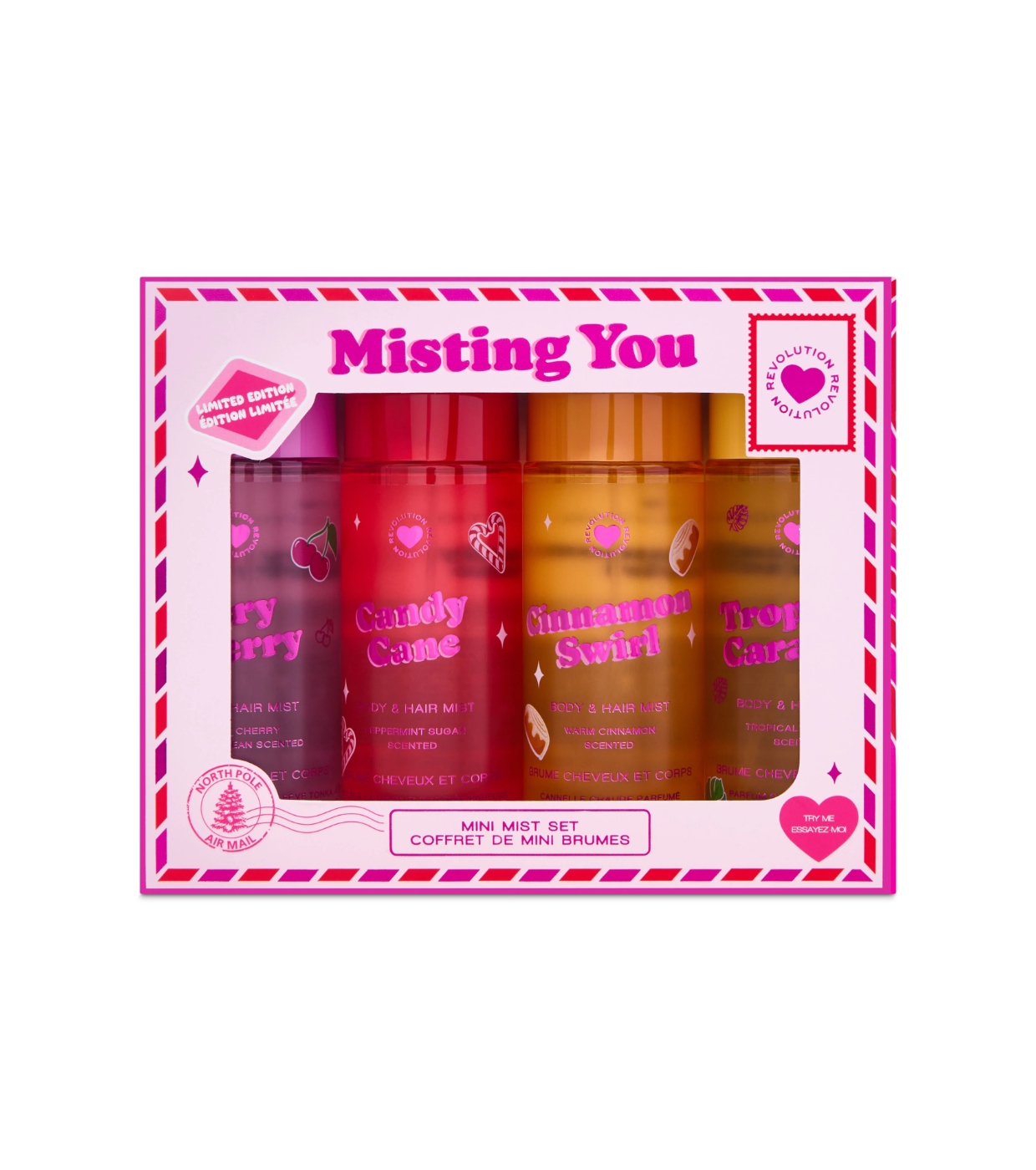 Surprise this holiday season with the I Heart Revolution Misting You Gift Set , a set of 4 mini body mists with irresistible aromas that will leave your skin fresh, perfumed and ready for any occasion.