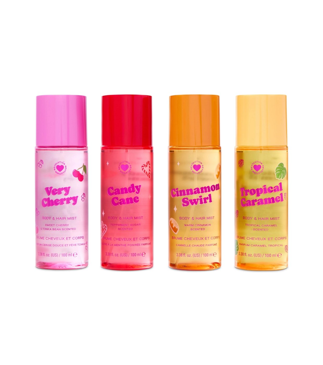TROPICAL CARAMEL BODY & HAIR MIST (INGREDIENTS): ALCOHOL DENAT., AQUA (WATER, EAU), PARFUM (FRAGRANCE), GLYCERIN, BENZOPHENONE-3, BHT, BENZYL SALICYLATE, BENZYL ALCOHOL, COUMARIN, LIMONENE. VERY CHERRY BODY & HAIR MIST (INGREDIENTS): ALCOHOL DENAT., AQUA (WATER, EAU), PARFUM (FRAGRANCE), BENZOPHENONE-3, BHT, ANISE ALCOHOL, COUMARIN. CANDY CANE BODY & HAIR MIST (INGREDIENTS): ALCOHOL DENAT., AQUA (WATER, EAU), PARFUM (FRAGRANCE), GLYCERIN, BENZOPHENONE-3, BHT, MENTHOL, VANILLIN, BENZYL SALICYLATE, COUMARIN, LIMONENE, MENTHA PIPERITA OIL, PINENE, BETA-CARYOPHYLLENE, TERPINEOL, LINALOOL. CINNAMON SWIRL BODY & HAIR MIST (INGREDIENTS): ALCOHOL DENAT., AQUA (WATER, EAU), PARFUM (FRAGRANCE), GLYCERIN, BENZOPHENONE-3, BHT, CINNAMAL, HEXYL CINNAMAL, AMYL CINNAMAL, VANILLIN, CINNAMOMUM ZEYLANICUM BARK OIL, LAVANDULA OIL/EXTRACT, CITRAL, COUMARIN, LINALOOL, LINALYL ACETATE, TERPINOLENE, LIMONENE, BETA-CARYOPHYLLENE.