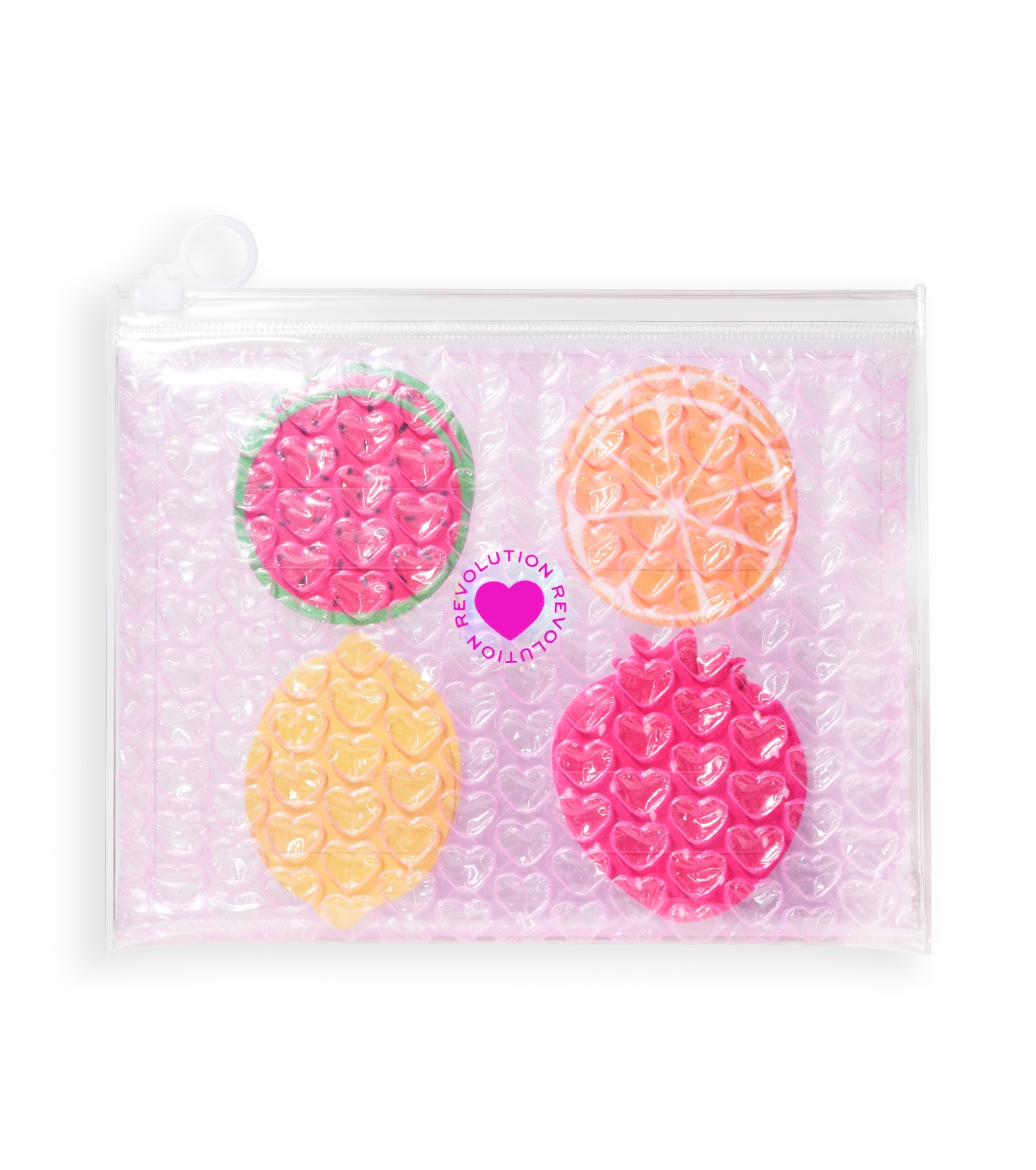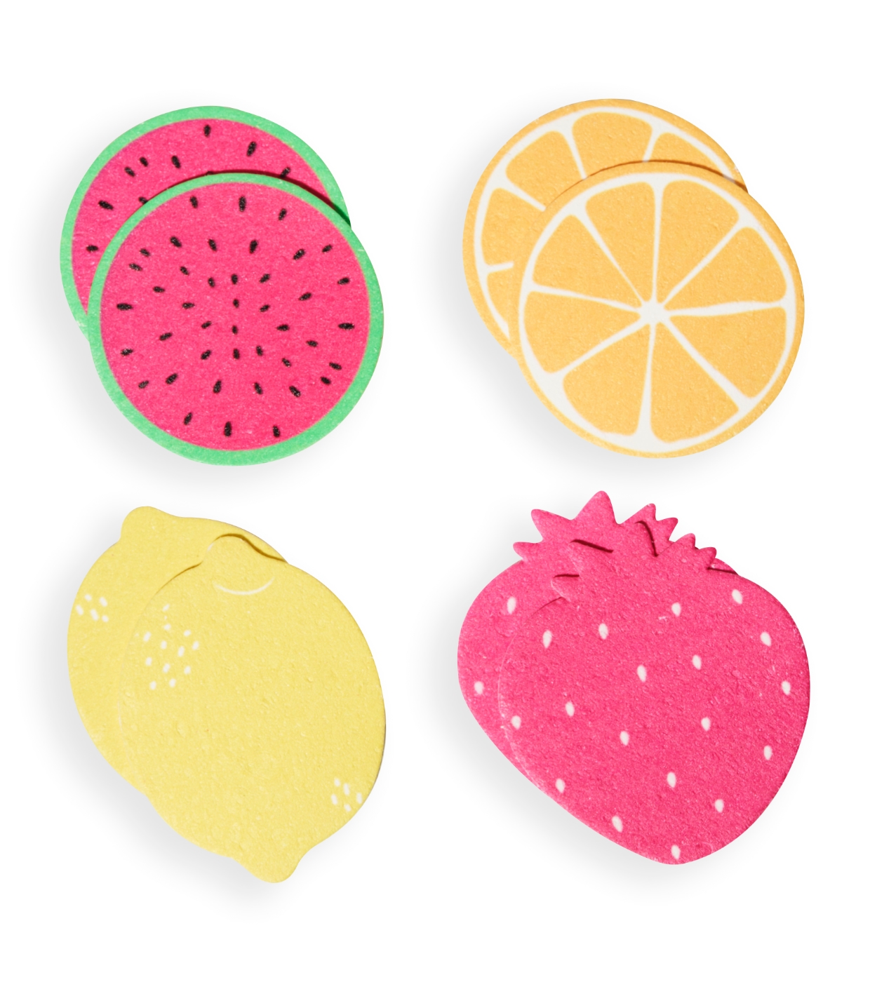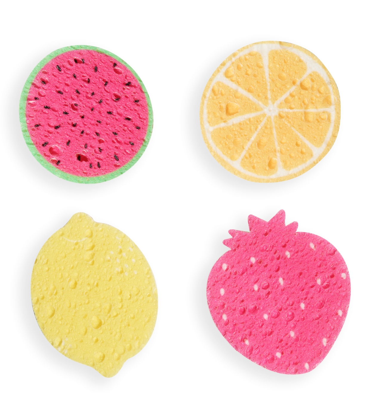 - 8 reusable fruity sponges with fun shapes that make facial cleansing a unique experience.