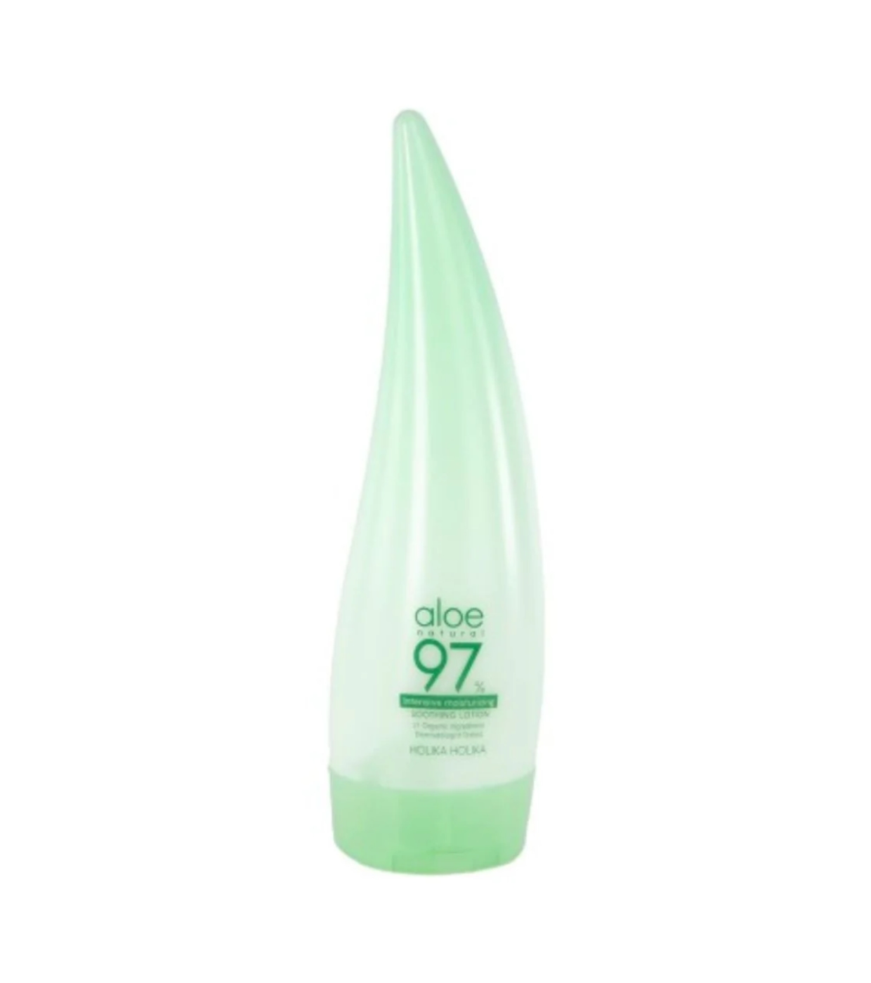 Holika Holika Aloe Natural Formula 97% Soothing Lotion is a light, fast-absorbing lotion formulated with 97% natural aloe vera, ideal for hydrating, soothing and regenerating the skin.
