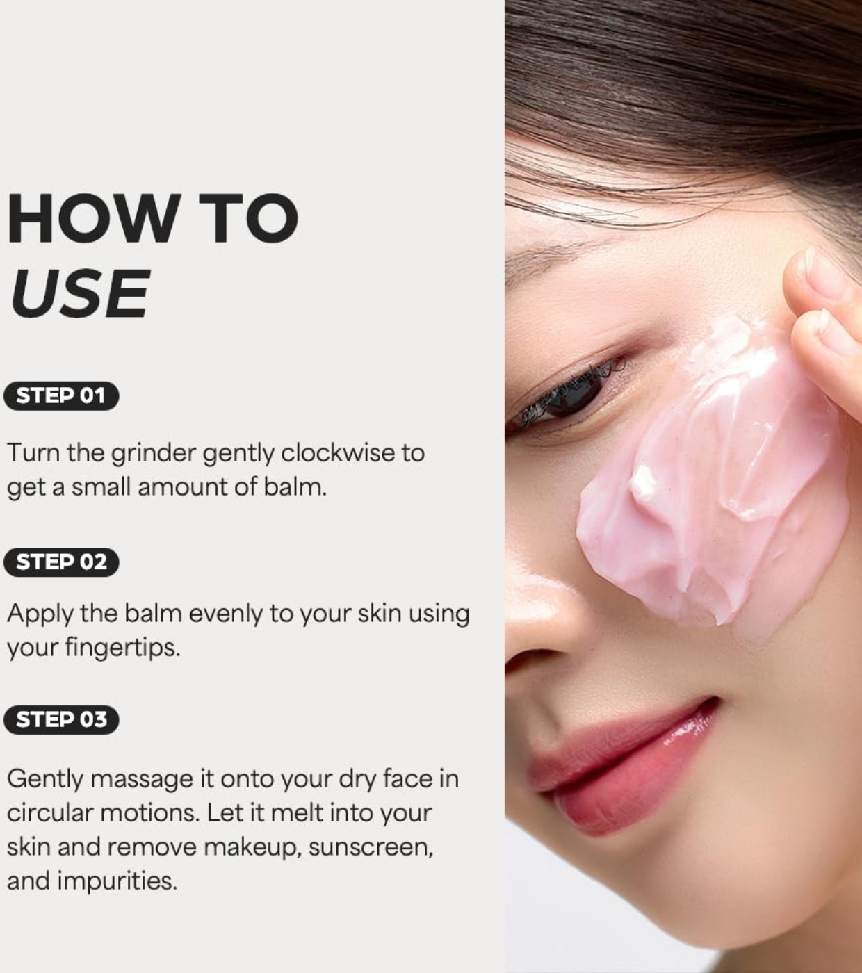 Massage the balm onto your dry face in a circular motion, allowing it to melt into your skin and dissolve makeup, sunscreen, and impurities.