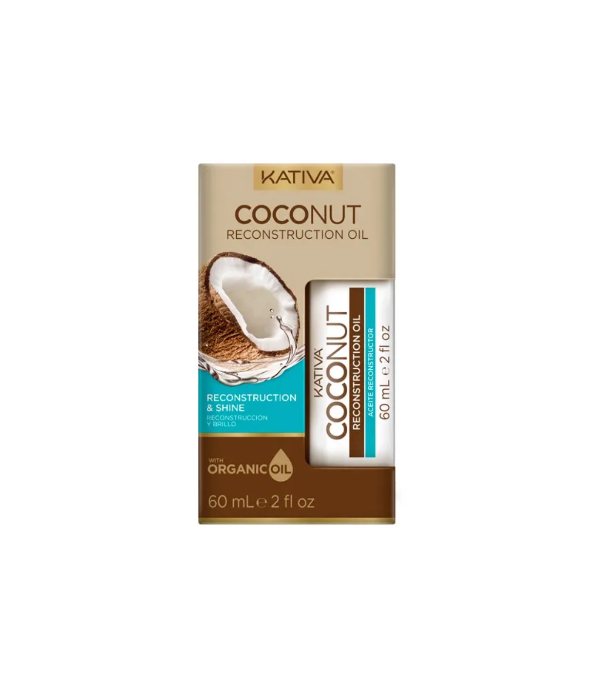 Kativa 's Coconut Reconstructing Oil is a repairing hair oil formulated to rebuild and revitalize damaged hair, restoring softness, shine and a healthy appearance.