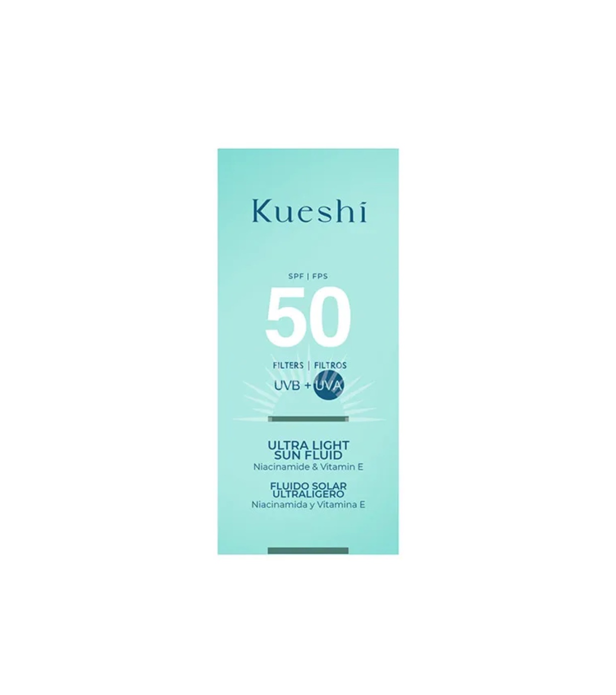 Kueshi 's ultra-light SPF 50 sun fluid offers optimal daily sun protection against UVA and UVB rays, helping to prevent premature aging and sunspots.