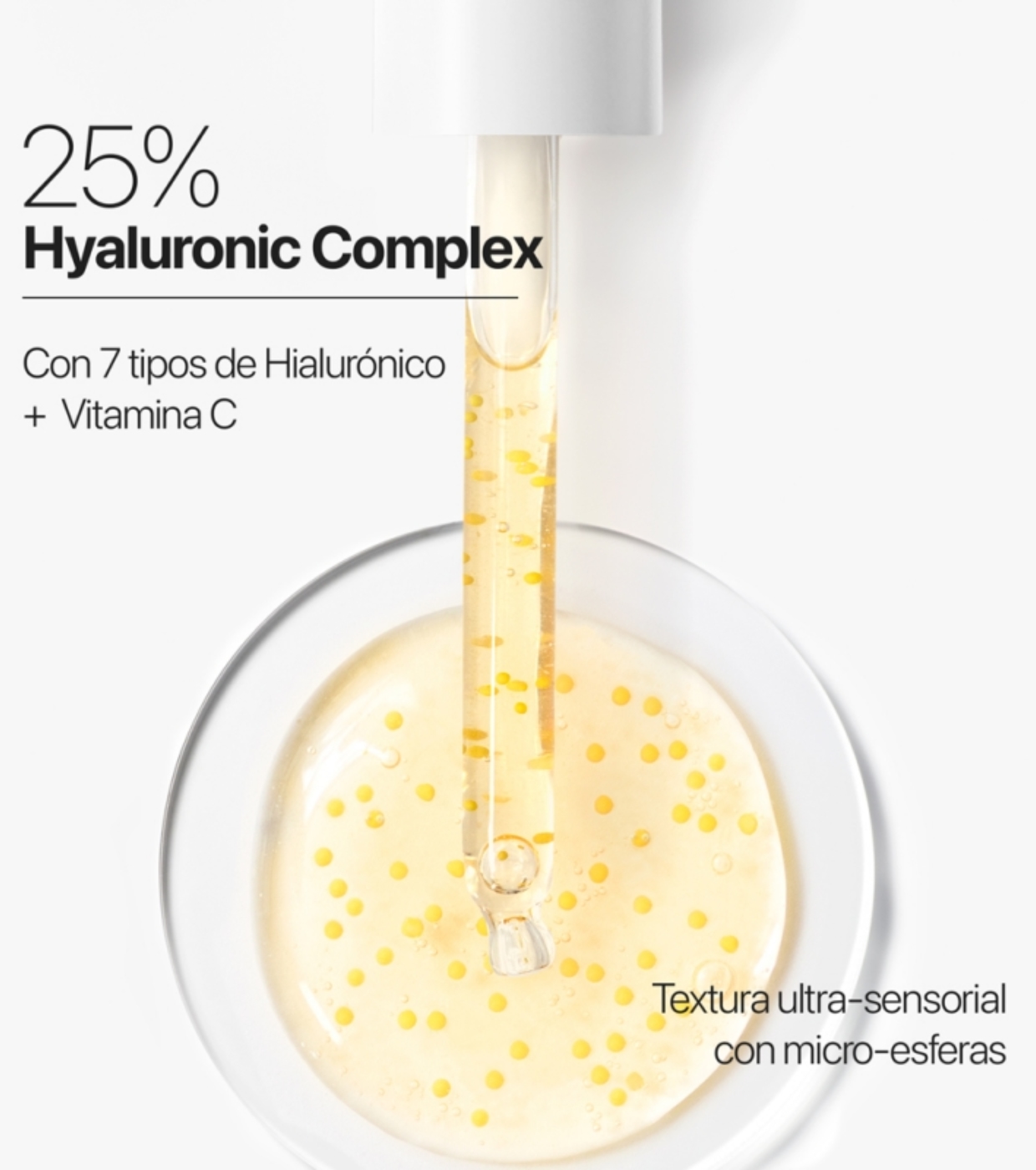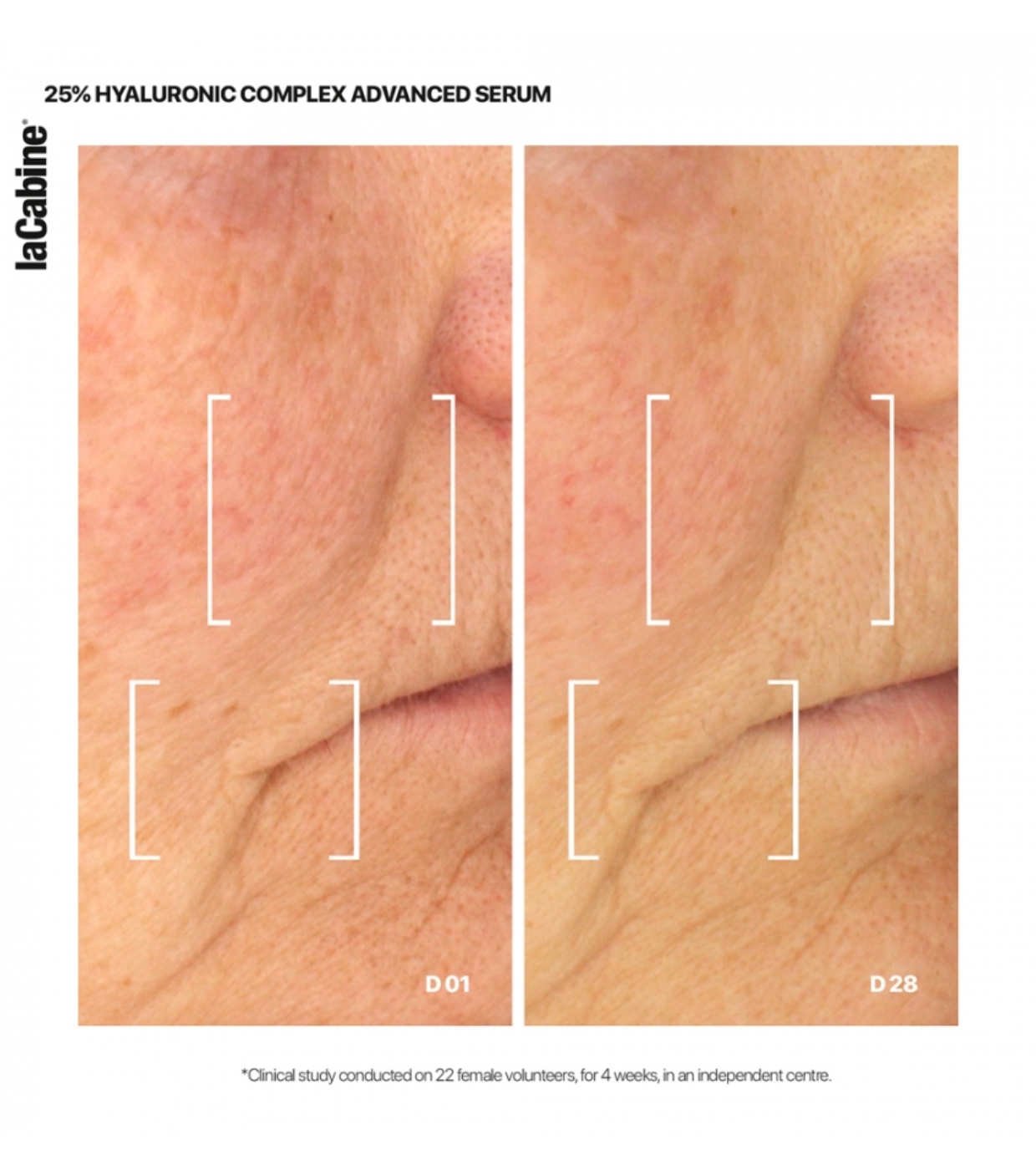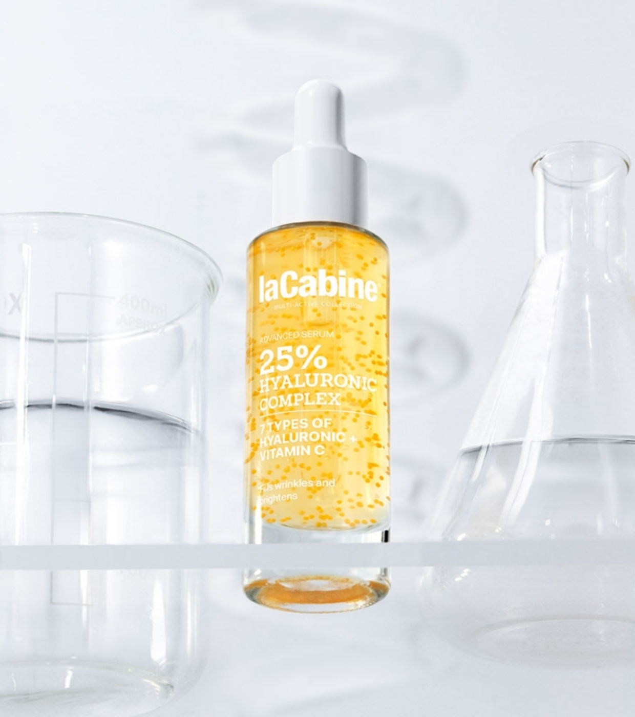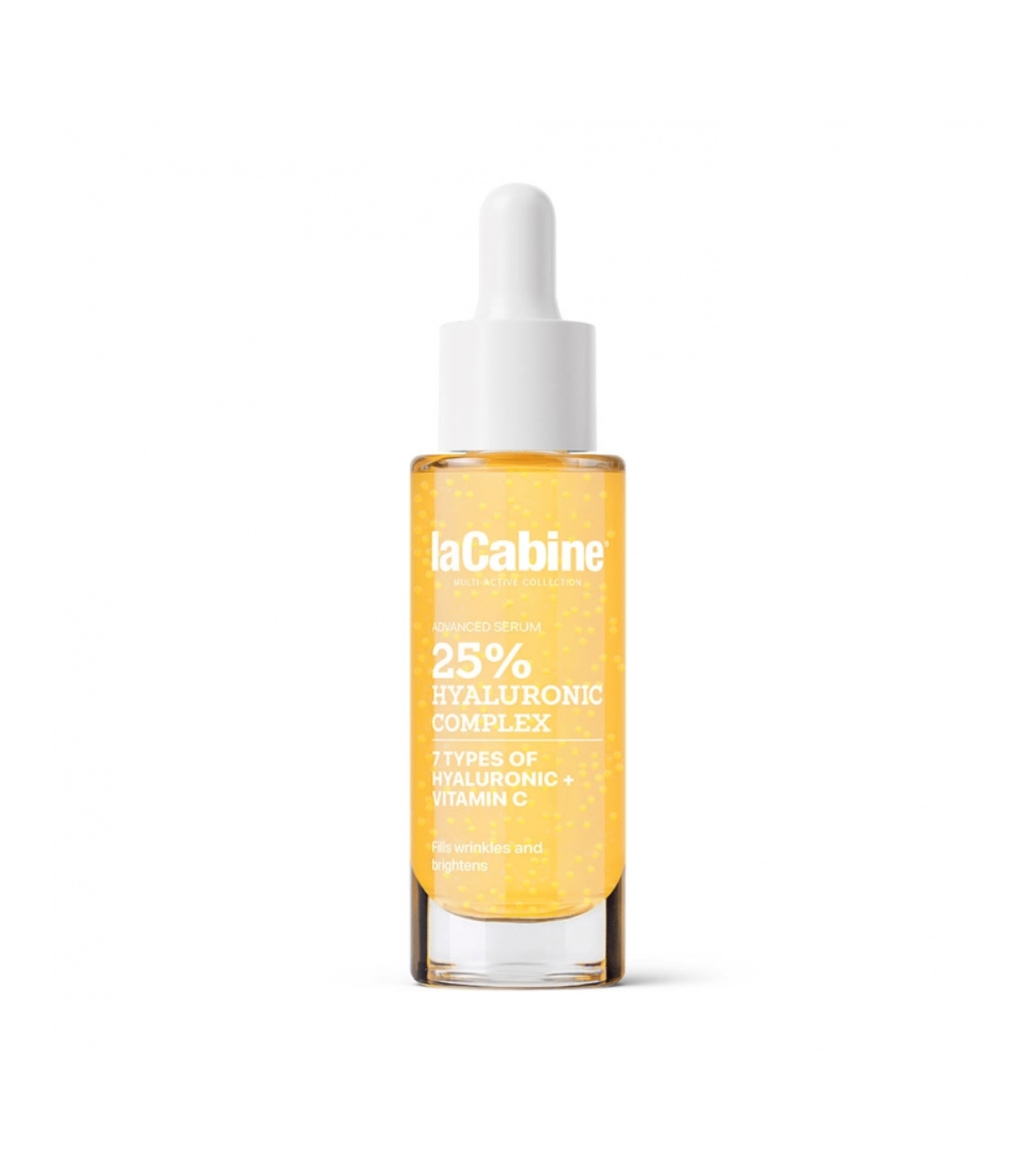 This advanced 25% Hyaluronic Complex serum from La Cabine combines a 25% complex of 7 types of Hyaluronic Acid with stabilized Vitamin C to deliver a complete action: it fills wrinkles, deeply hydrates and brightens the skin from the first application.