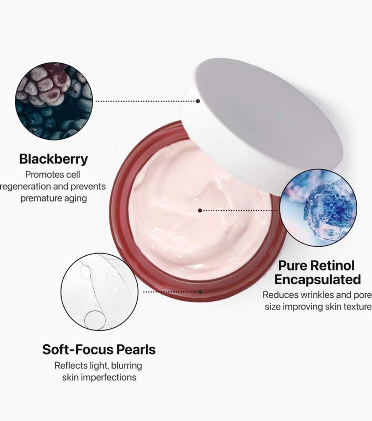 A unique formula with Pure Encapsulated Retinol, Blackberry Extract, Squalane, Soft-Focus Pearls and Anti-Pollution Shield.