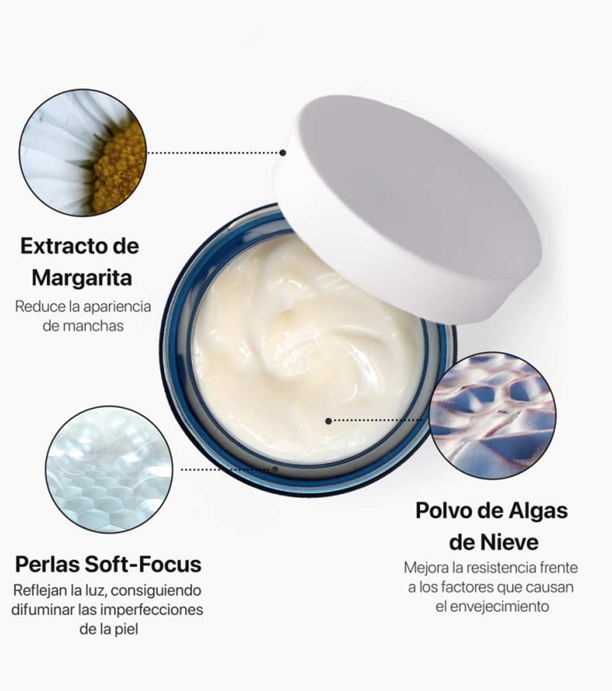 A unique formula with Snow Algae Powder, Daisy Flower, Shea Butter, Soft-Focus Pearls and Anti-Pollution Shield.