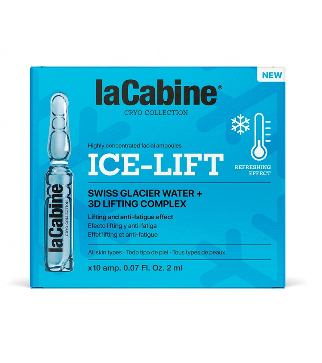 Instantly refresh your skin with this facial ampoule formulated with Swiss Glacier Water and a 3D Lifting Effect Complex.