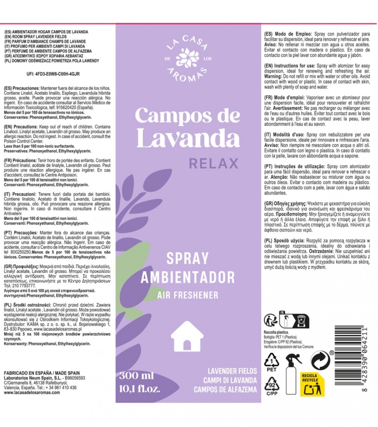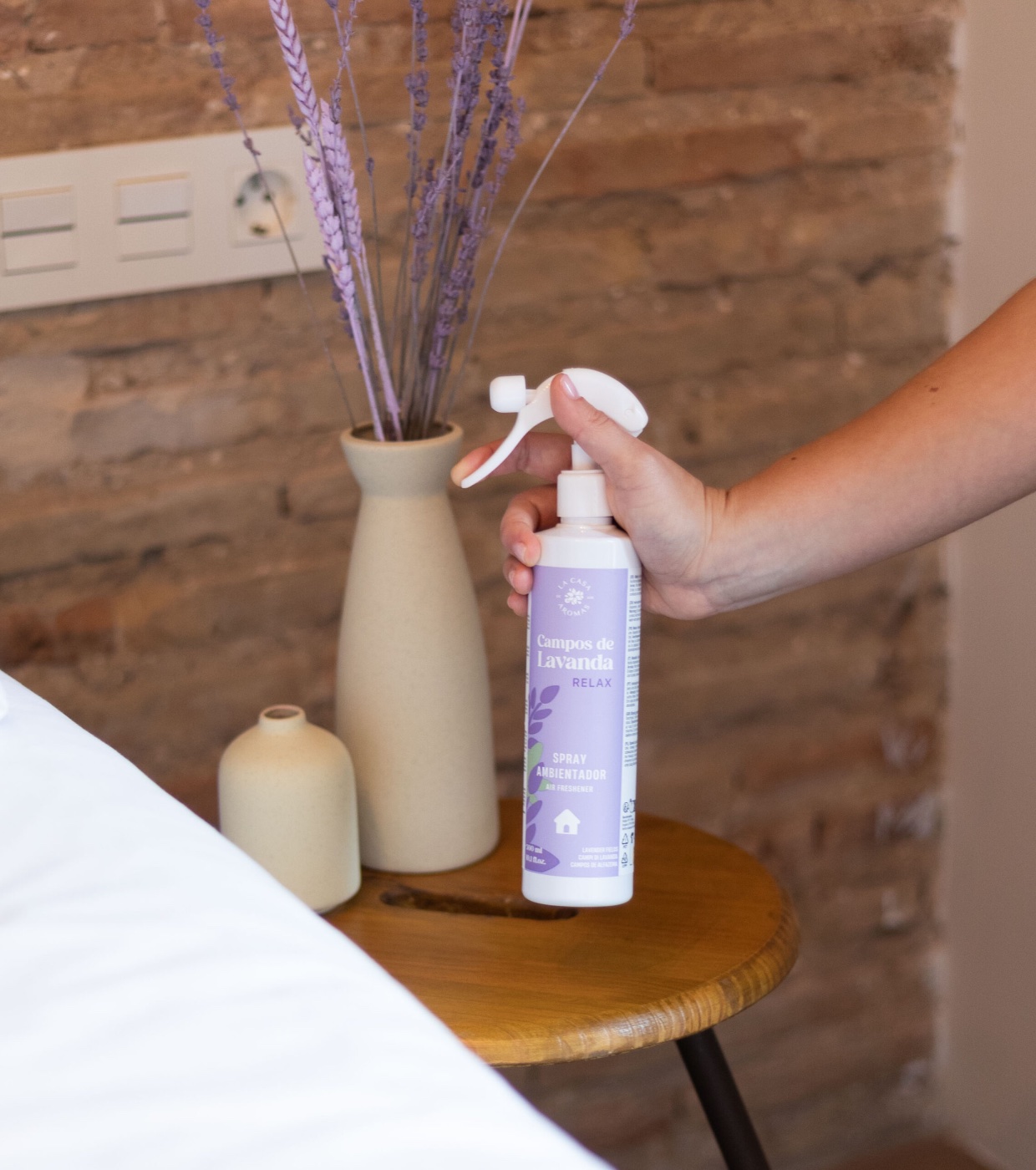 Renew the atmosphere of your home with the Campos de Lavanda spray air freshener from La Casa de los Aromas , your perfect ally to transform any room into a more welcoming, clean and well-being space.