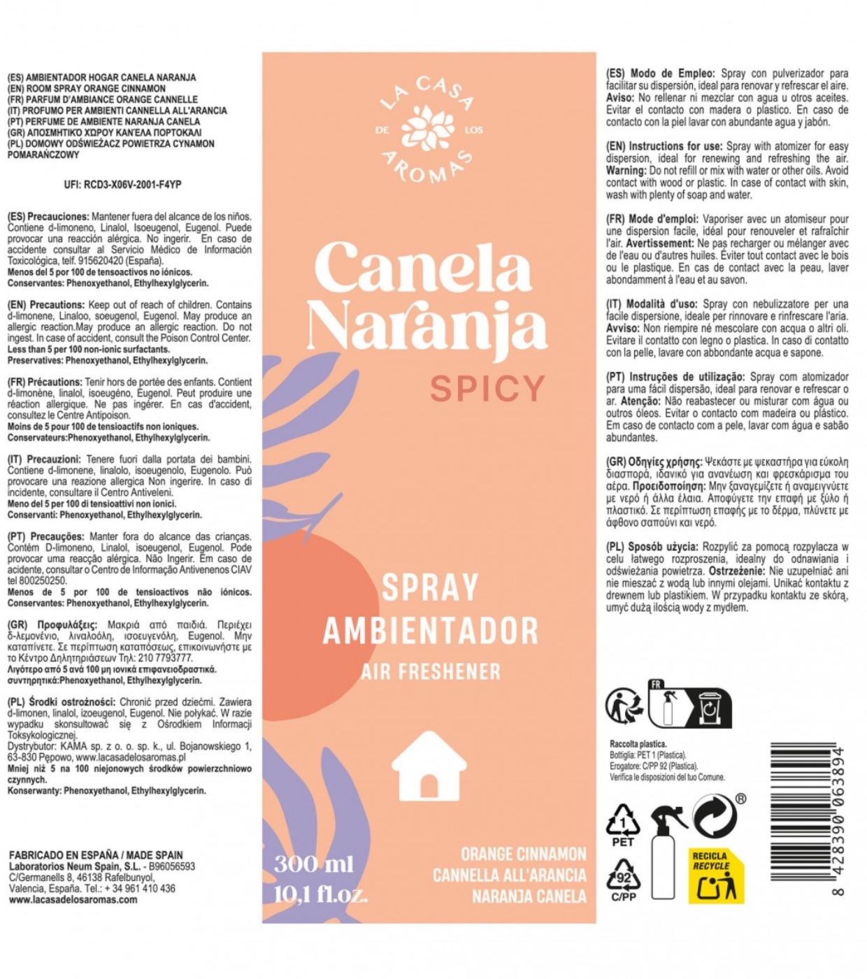 Turn every corner of your home into an oasis of freshness with the Canela Naranja spray air freshener from La Casa de los Aromas , your best ally to create cozy and lively environments.