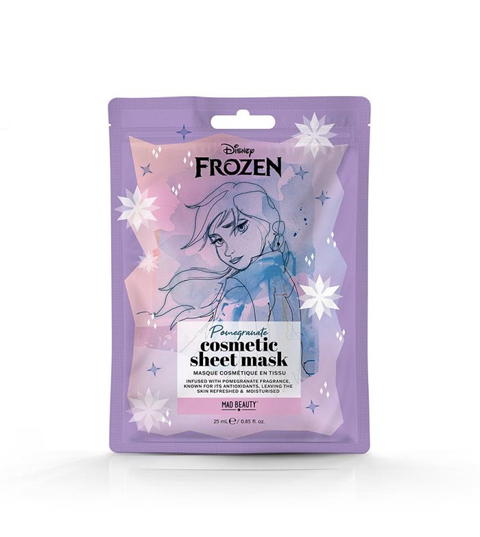 This biodegradable fiber mask inspired by Disney Frozen is printed with an Anna design and is infused with a serum formulated with pomegranate extract and hydrating hyaluronic acid to leave skin fresh and hydrated.