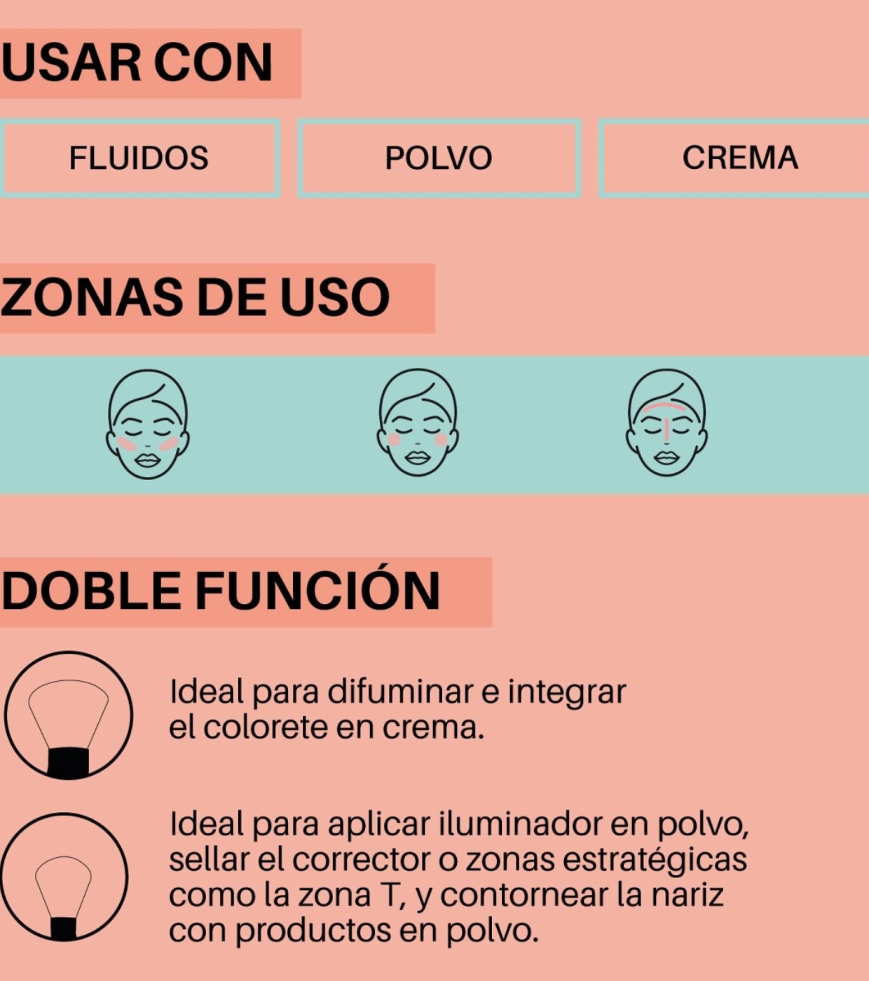 - Wide tip: Blends and integrates cream blush onto cheeks and larger areas of the face. Allows for the application and blending of bronzer or foundation thanks to the shape and density of its fibers.