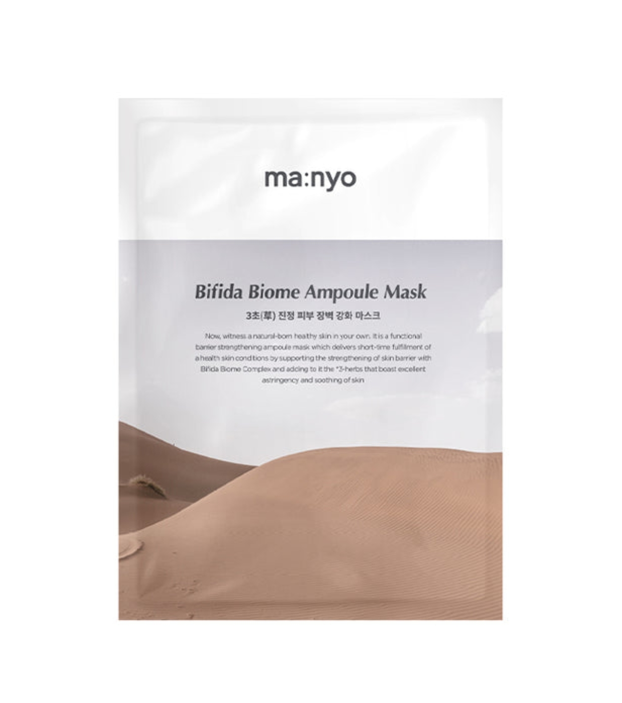 Manyo Bifida Biome Ampoule Mask is a single-use facial mask that provides an intensive repairing and soothing treatment thanks to its high concentration of probiotic ferments.
