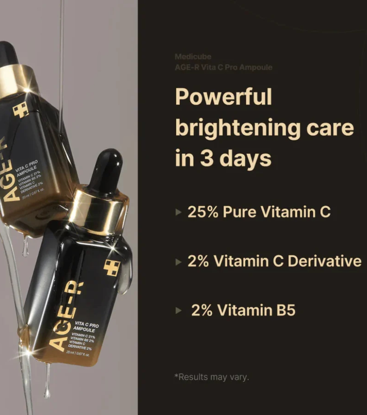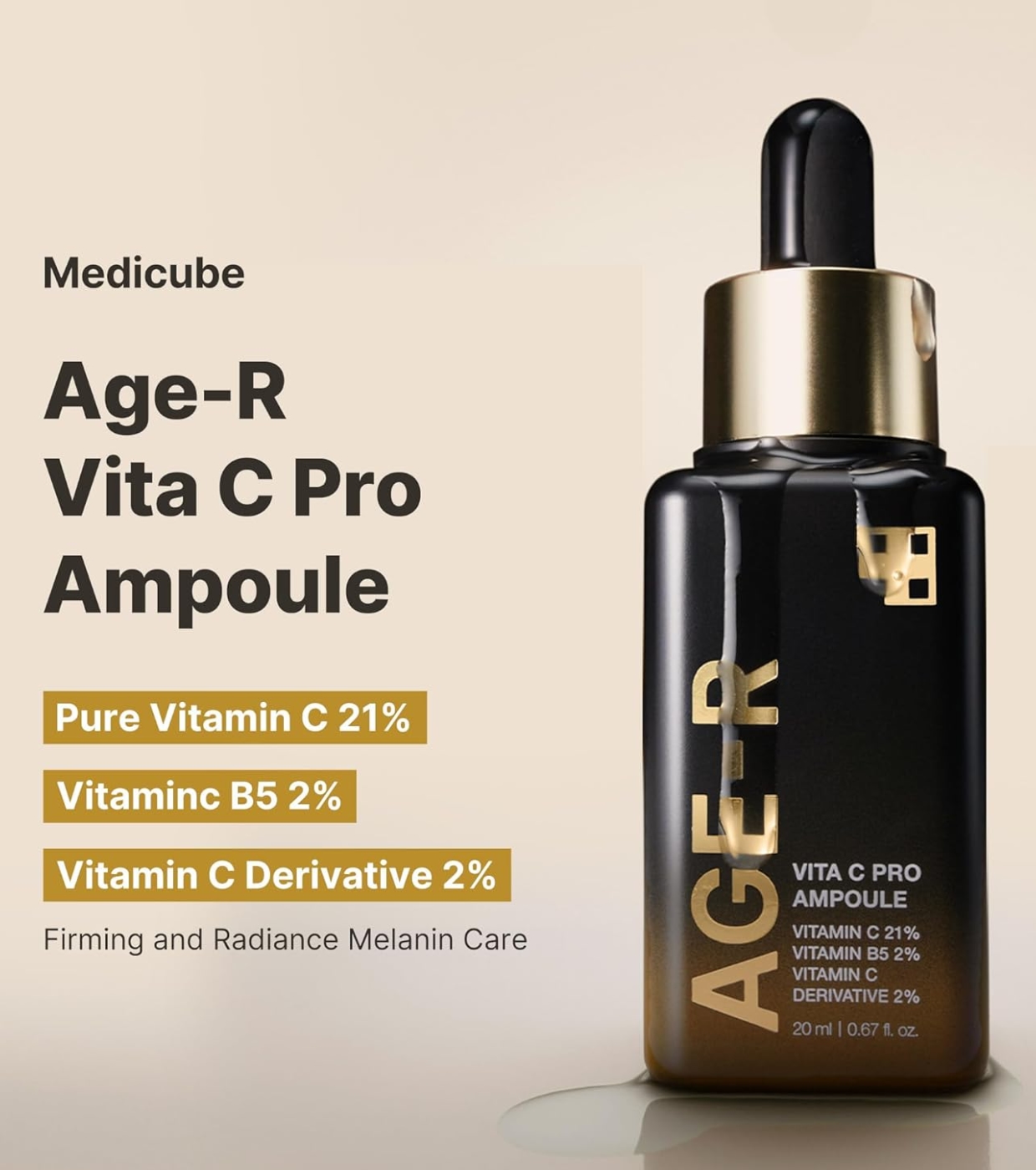 - 25% Pure Vitamin C: Powerful antioxidant that reduces pigment spots, improves skin tone and provides instant radiance.