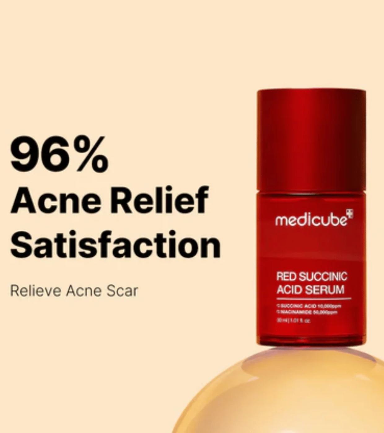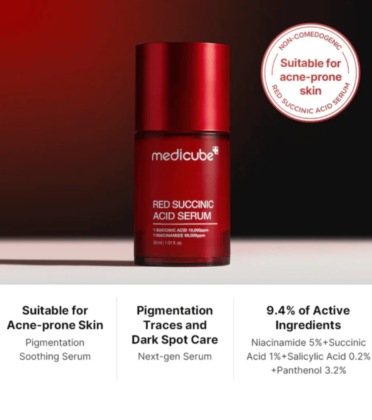 Clarify and balance your skin with Medicube Red Succinic Acid Clarifying Serum , a non-comedogenic and hypoallergenic exfoliating serum specially formulated for acne-prone, sensitive or unbalanced skin.