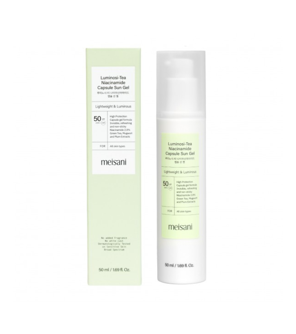Luminosi-Tea Niacinamide Capsule Sun Gel SPF 50 is an ultra-light gel sunscreen that offers high broad-spectrum (UVA/UVB) protection and a luminous, moisturizing, and comfortable finish.