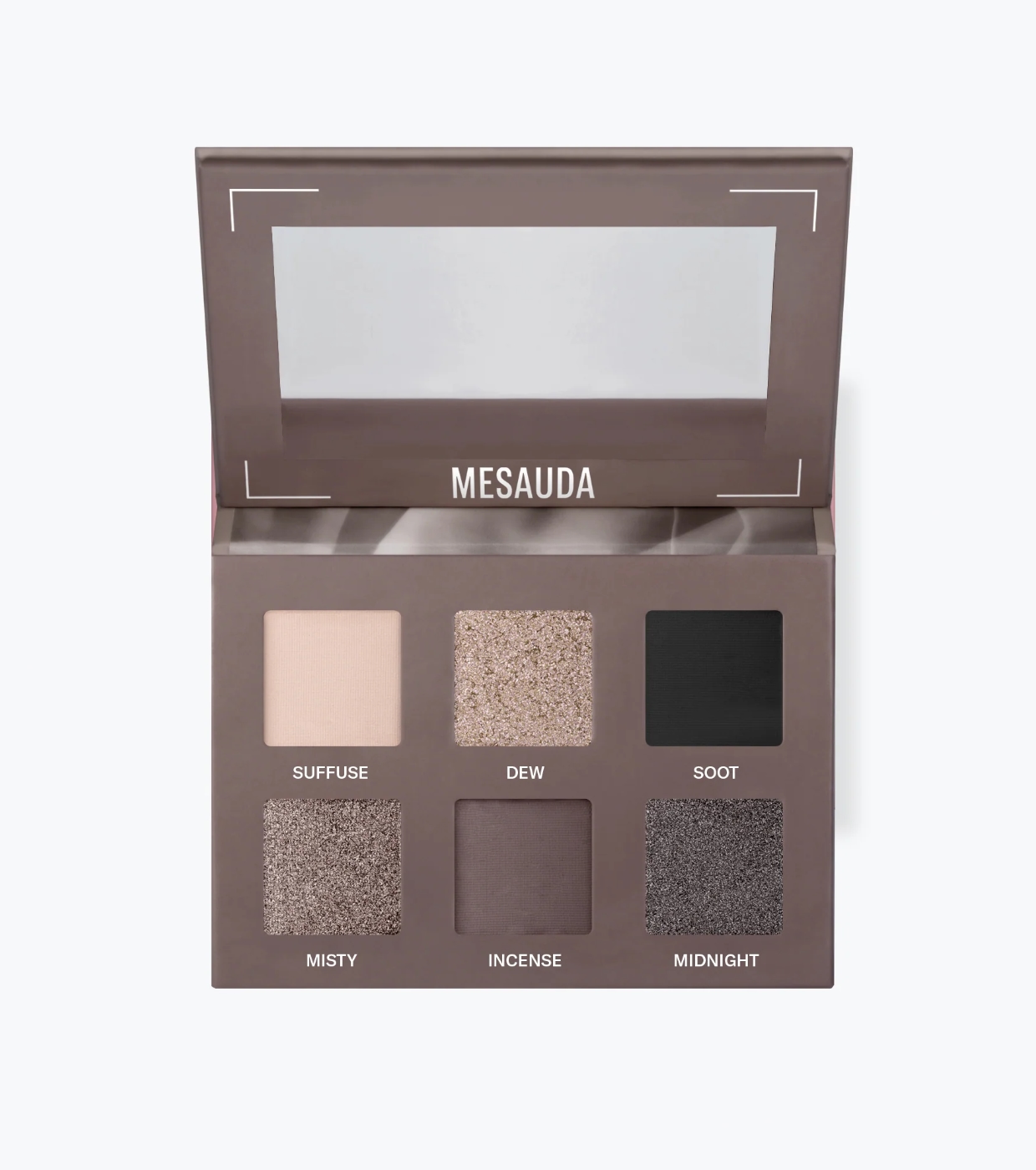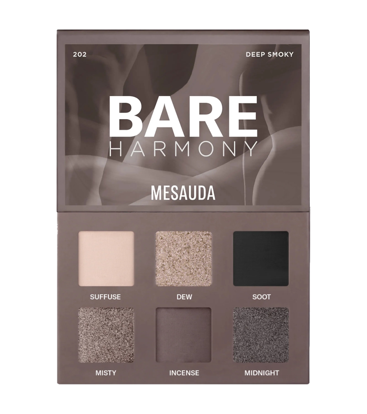 The Bare Harmony 2.0 eyeshadow palette from Mesauda features an elegant range of grays, from white to black, incorporating unique highlights to enhance the eyes.