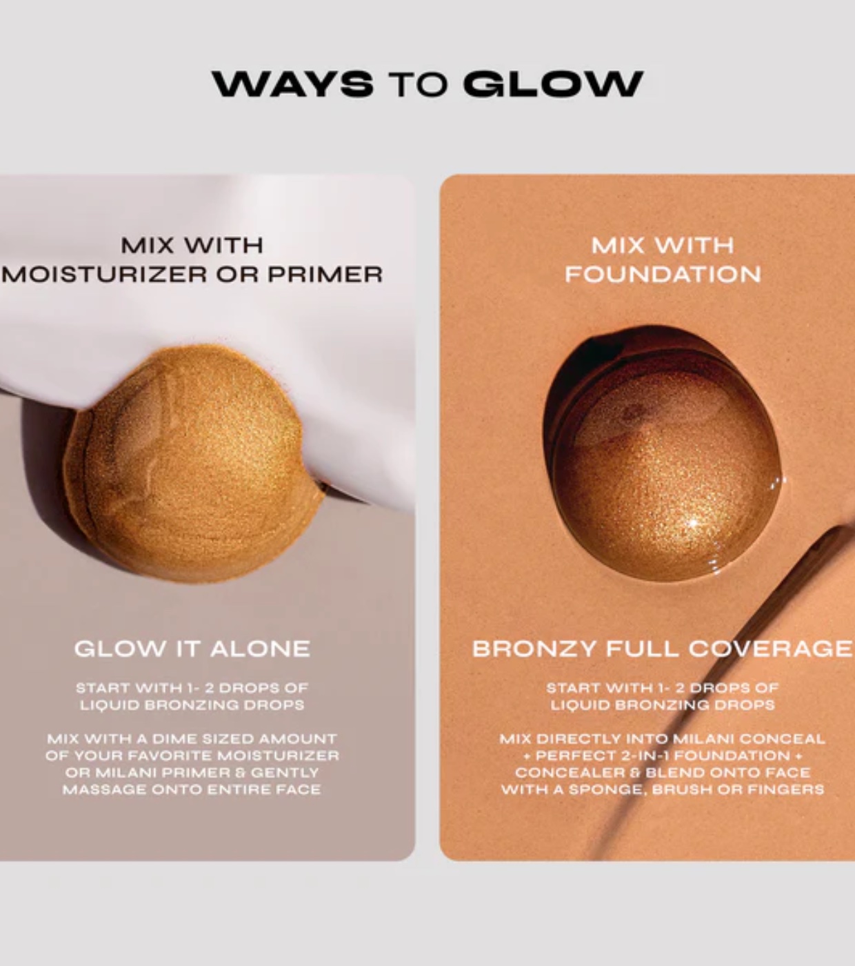 Mix 1-2 drops of product into a dime-sized amount of your favorite moisturizer or Milani Face Primer and blend with your fingers all over your face for a flawless, glowing base.