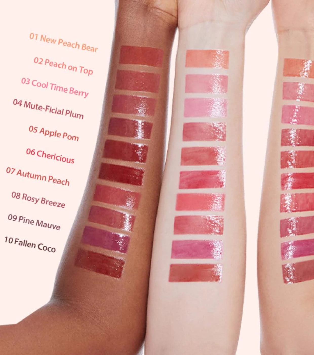 Aqua, Diisostearyl Malate, Dimer Dilinoleyl Dimer Dilinoleate, Polyglyceryl-10 Decaisostearate, Bis-Behenyl/Isostearyl/Phytosteryl Dimer Dilinoleyl Dimer Dilinoleate, Butylene Glycol, Polysorbate 60, Glycerin, Ceteareth-20, Pentaerythrityl Tetraisostearate, PEG-240/HDI Copolymer Bis-Decyltetradeceth-20 Ether, Phenoxyethanol, Menthoxypropanediol, Hydroxyethyl Acrylate/Sodium Acryloyldimethyl Taurate Copolymer, Polyurethane-14, Squalane, Caprylyl Glycol, CI 77891, Polyglyceryl-2 Triisostearate, 1, 2-Hexanediol, Ethylhexylglycerin, Parfum, Propanediol, CI 45410, CI 19140, Sorbitan Isostearate, CI 17200, Aluminum Hydroxide, Illicium Verum Fruit Extract, Hexylene Glycol, Potassium Laurate, Tocopherol, CI 42090, Prunus Persica Fruit Extract, Prunus Salicina Fruit Extract, Pyrus Malus Fruit Extract, Fragaria Ananassa Fruit Extract.