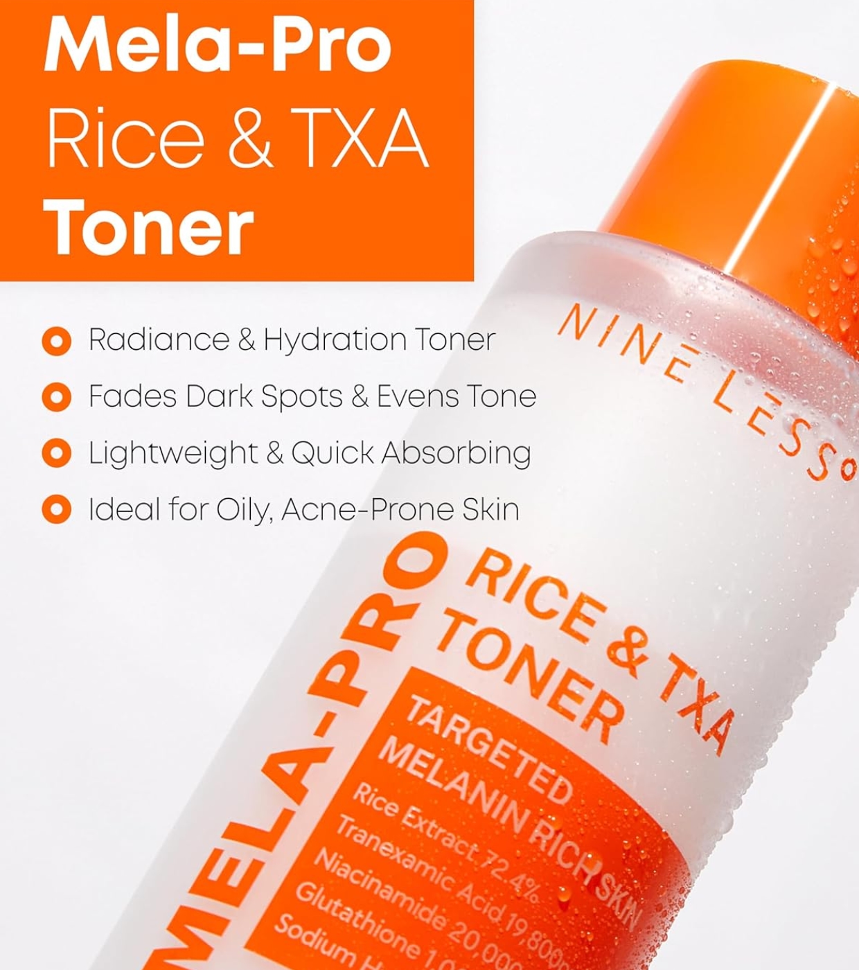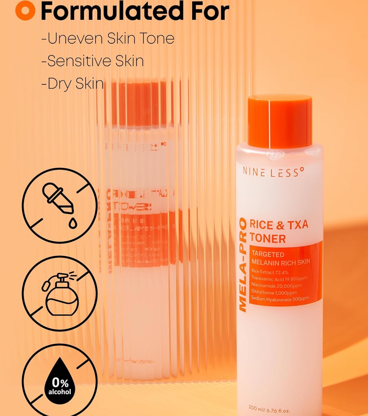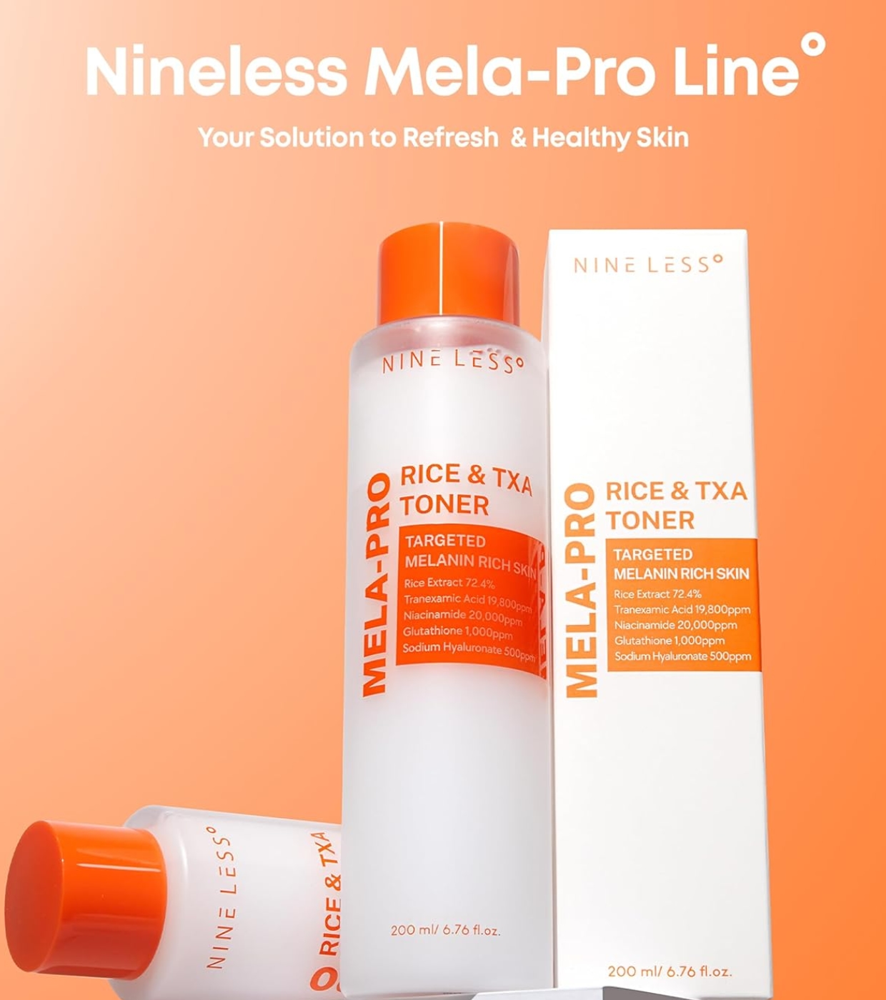 Nineless Rice and Nineless Facial Toner is designed to effectively treat dark spots, hyperpigmentation, and uneven skin tone.