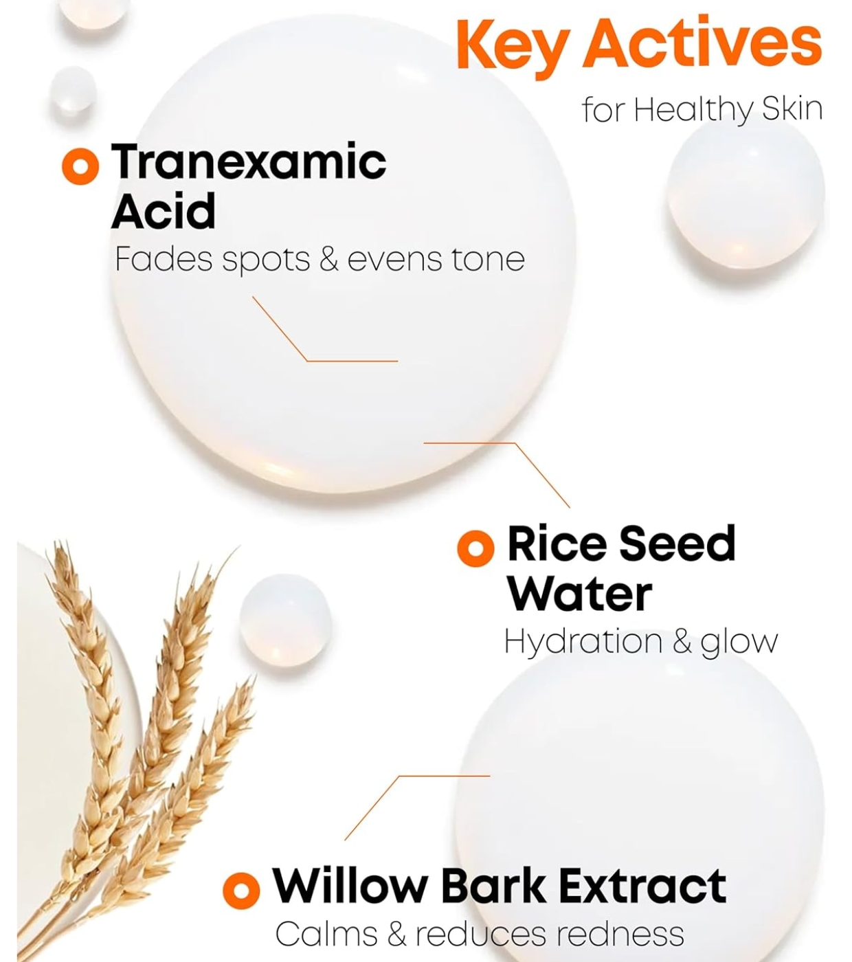Its formula combines 72.4% rice seed water (Oryza sativa), rich in nutrients, with tranexamic acid, a powerful active ingredient that helps fade sun spots, acne scars, melasma, and post-inflammatory hyperpigmentation.