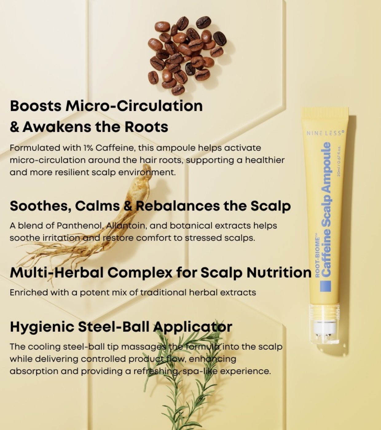 Strengthen and nourish your natural hair biome with this intensive scalp ampoule from Nineless , formulated with caffeine and enriched with panthenol and menthol to provide an immediate feeling of freshness and relief.