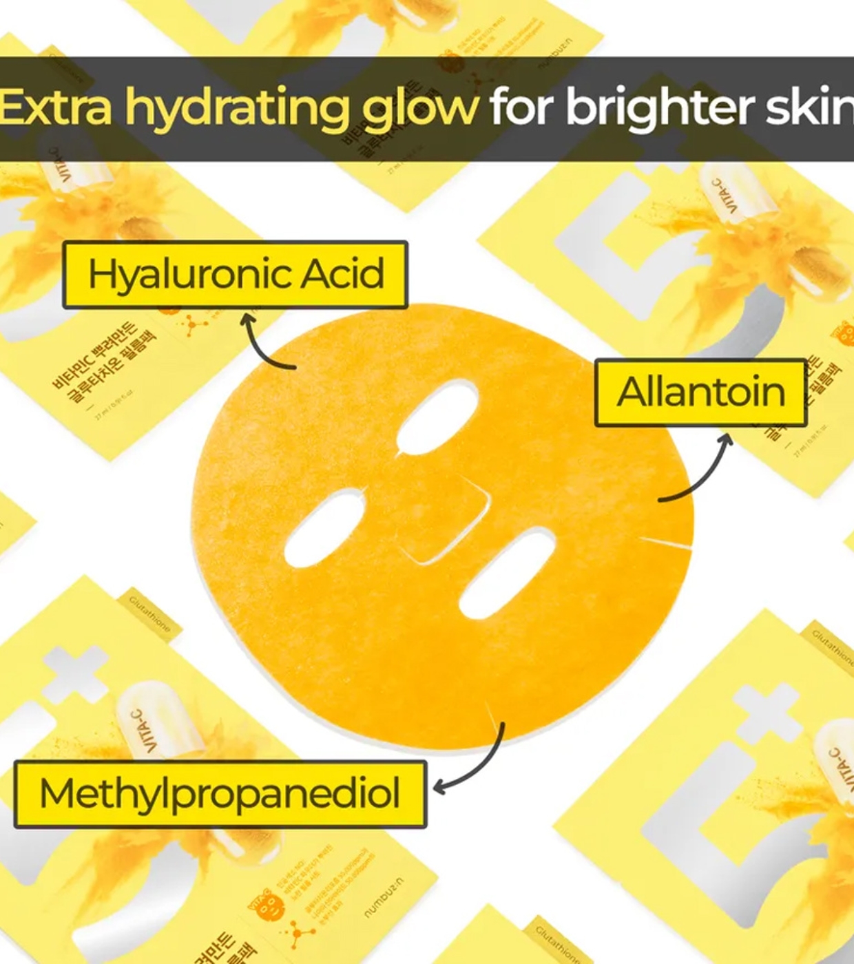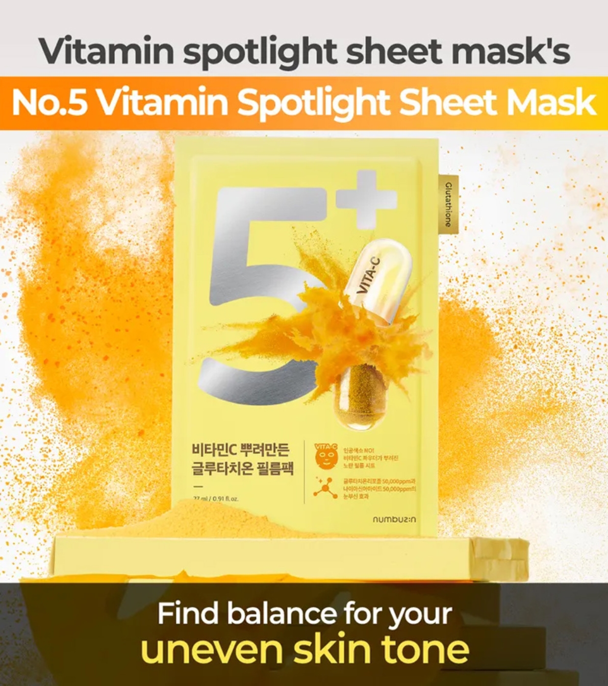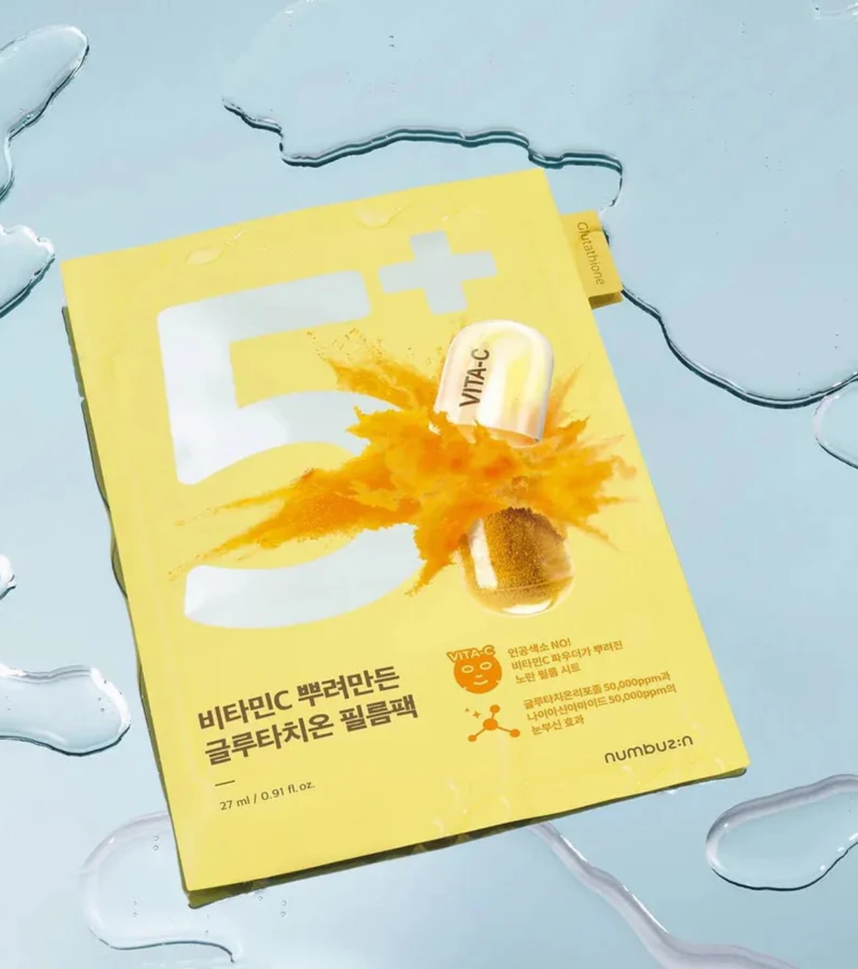 Restore radiance to your skin with this brightening face mask No.5+ Glutathione Vitamin Concentrated from Numbuzin ampoule type, formulated with liposomal glutathione, niacinamide and vitamin C to treat dullness and blemishes.