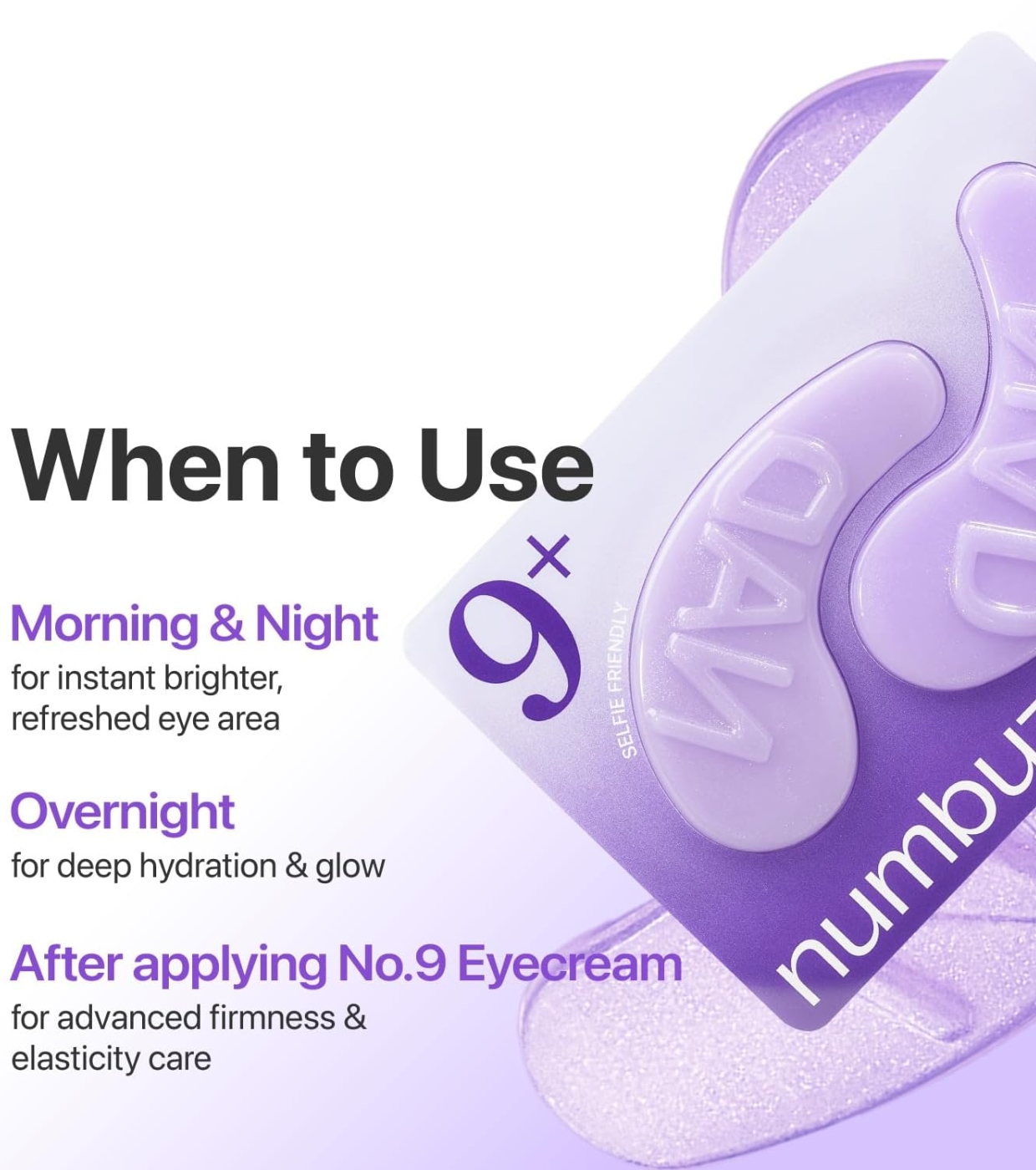 Restore energy, firmness and radiance to the eye contour with NAD+ No. 9 Under Eye Collagen Patches from Numbuzin , highly effective anti-aging hydrogel patches designed to intensively treat the signs of fatigue and aging in the delicate eye area.