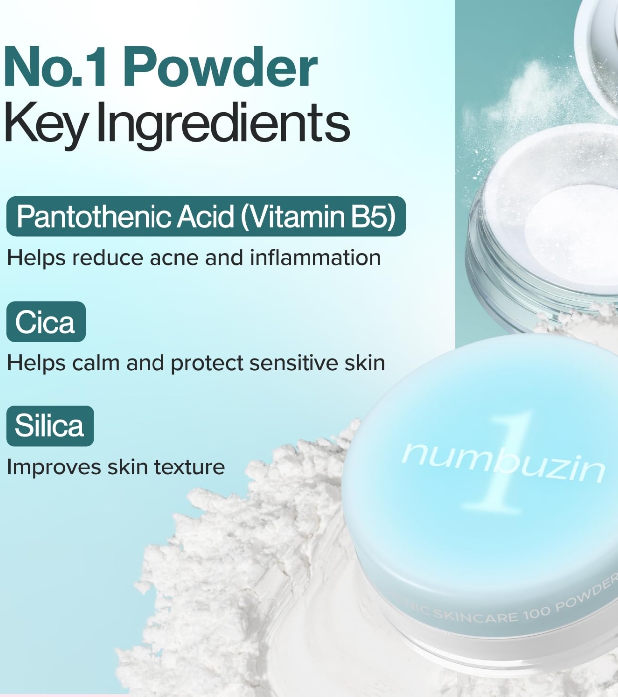 Achieve smooth, shine-free, and cared-for skin with No.1 Pantothenic Skincare 100 mattifying powder from Numbuzin, a mattifying powder that not only perfects the finish of your makeup but also treats your skin.