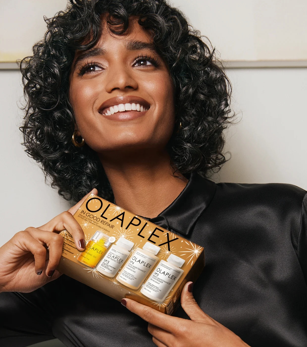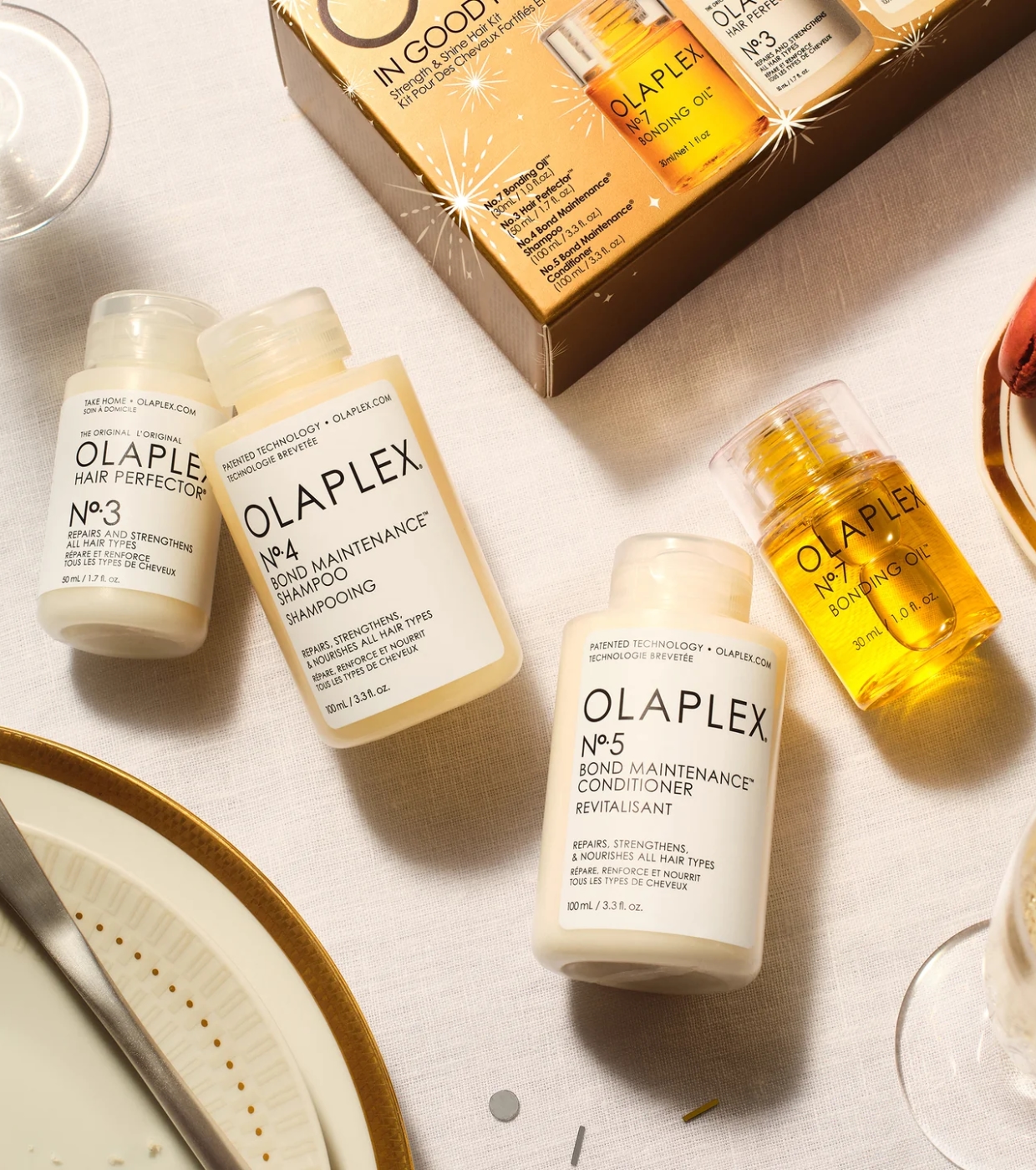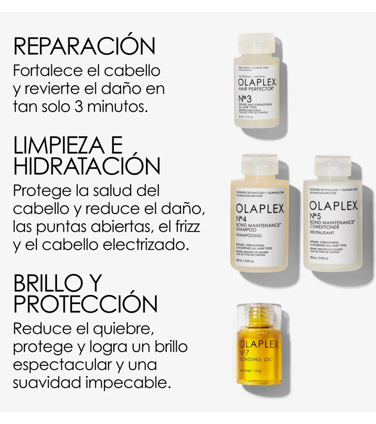 The set contains: Olaplex Hair Perfector Nº 3 + Olaplex Nº 4 Bond Maintenance Shampoo + Olaplex Nº7 Bonding Oil + Olaplex Nº5 Bond Maintenance Aconditionador.