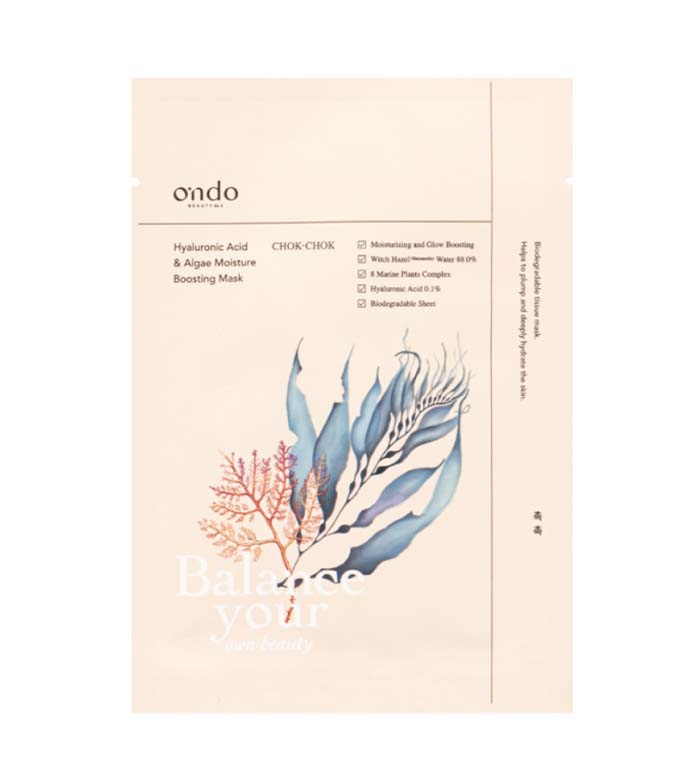The Hydrating Mask Chok-Chok Hyaluronic Acid & Algae from Ondo Beauty 36.5 is made with a biodegradable fabric and contains 88% witch hazel, a complex of 8 marine plants and niacinamide, which help plump and deeply hydrate the skin.