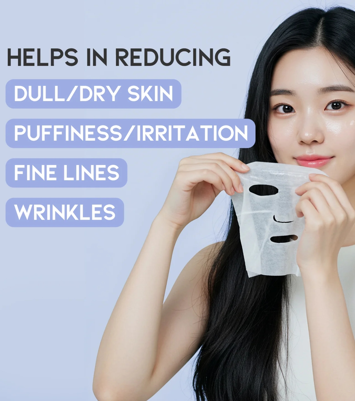 Remove the mask from the package and apply it evenly over your face, avoiding the eye and mouth area.