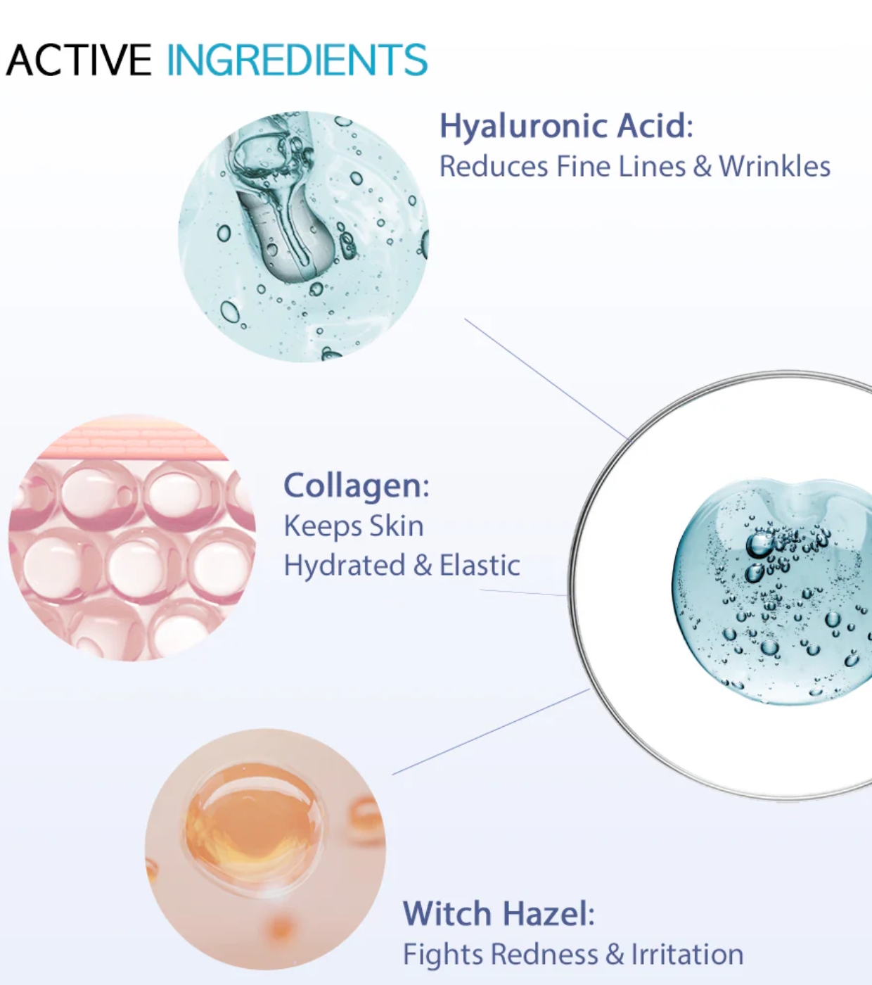Water, Glycerin, Methylpropanediol, 1,2-Hexanediol, Butylene Glycol, Carbomer, Tromethamine, Ethylhexylglycerin, Propanediol, Polyglyceryl-10 Laurate, Allantoin, Fragrance, Hamamelis Virginiana (Witch Hazel) Leaf Extract, Hydrolyzed Collagen, Soluble Collagen, Sodium Hyaluronate, AteloCollagen