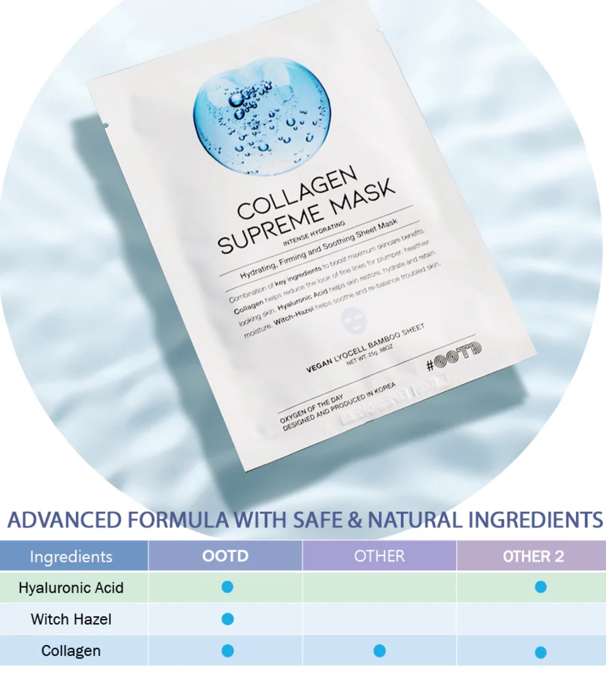 Revitalize your skin with our regenerating facial mask Collagen Supreme Mask from OOTD Beauty , formulated with a powerful combination of collagen, hyaluronic acid and witch hazel to provide complete care.