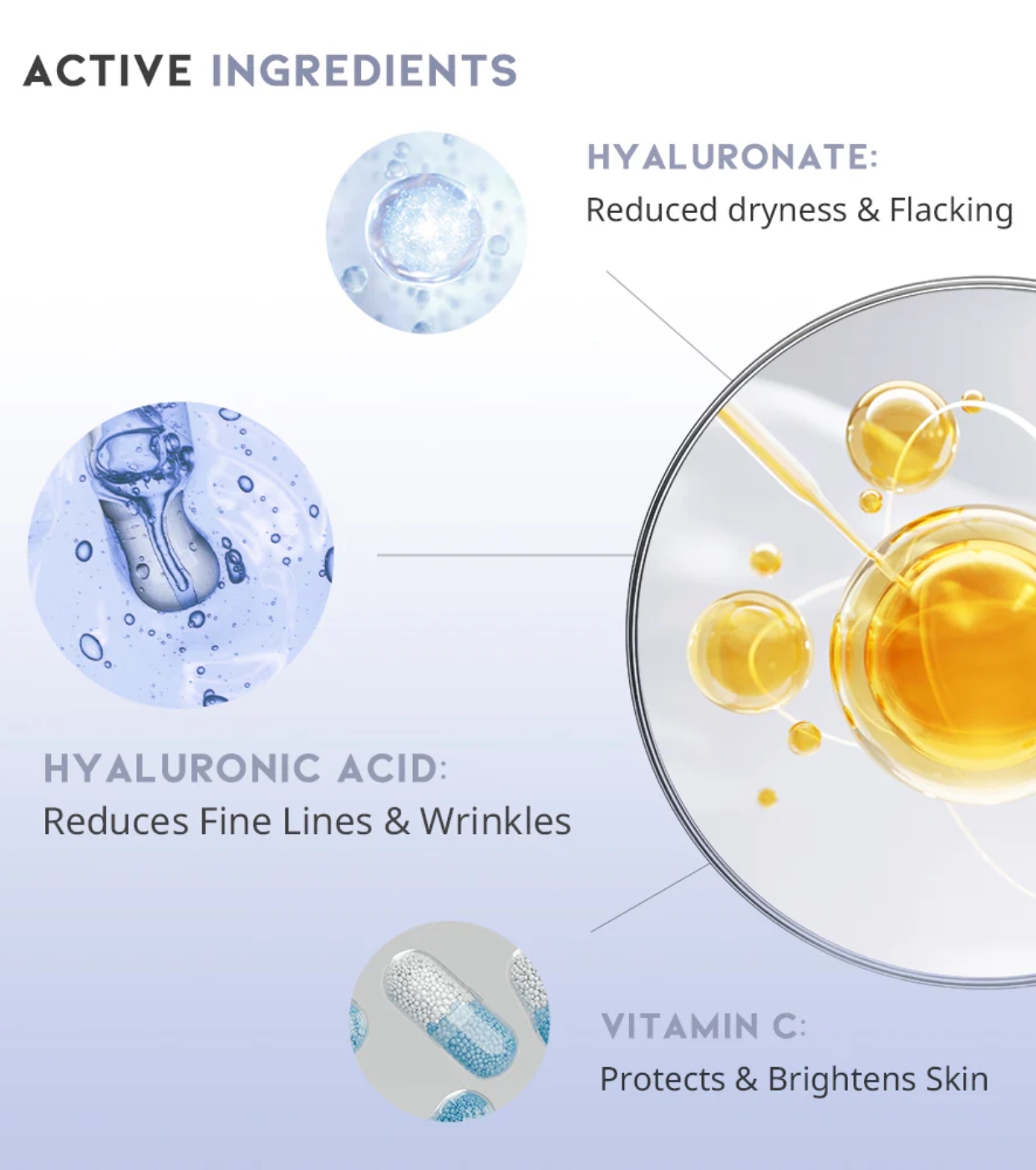 - 8 Hyaluronan Molecules – Hydrate at different levels of the skin for maximum moisture retention.