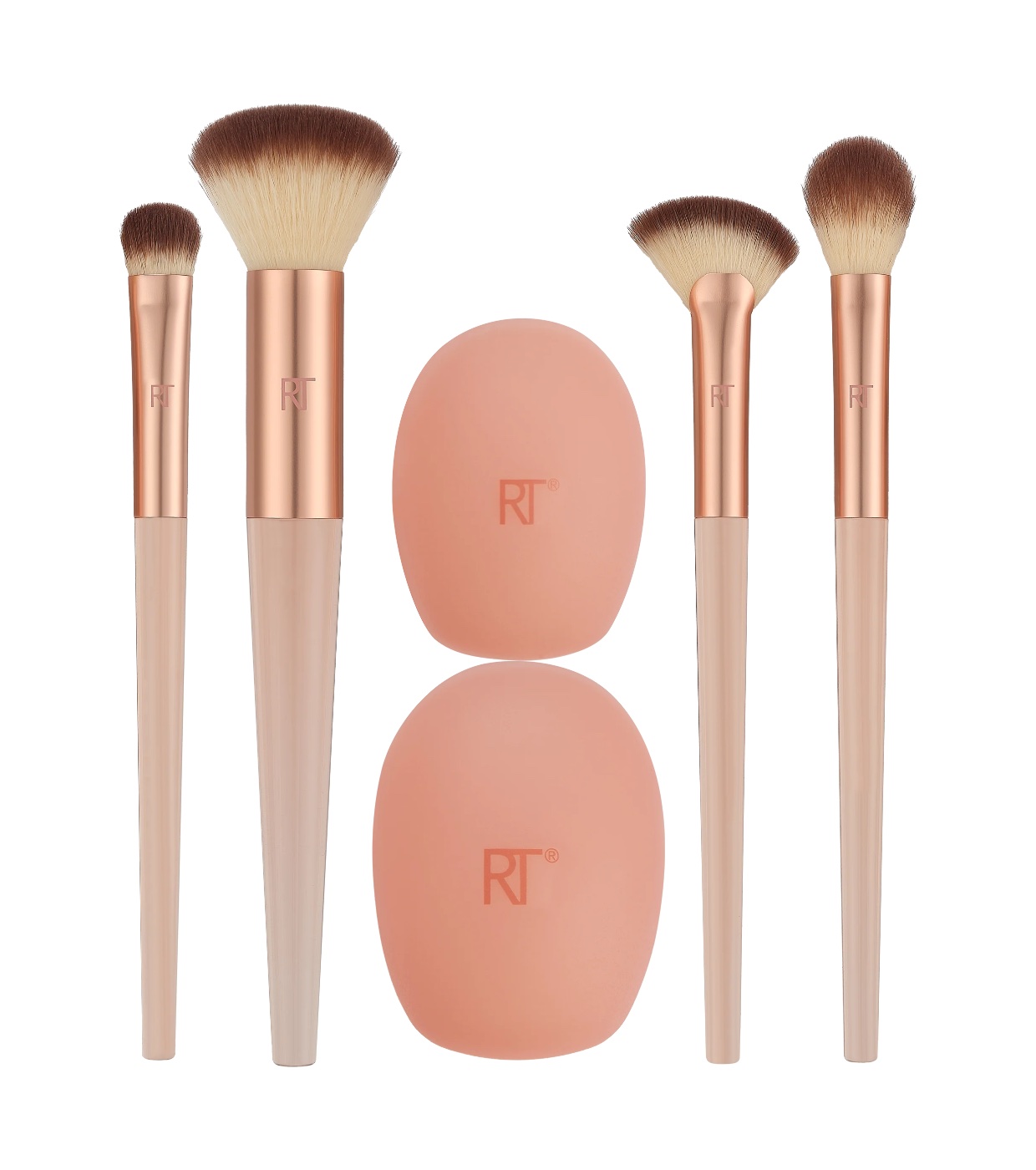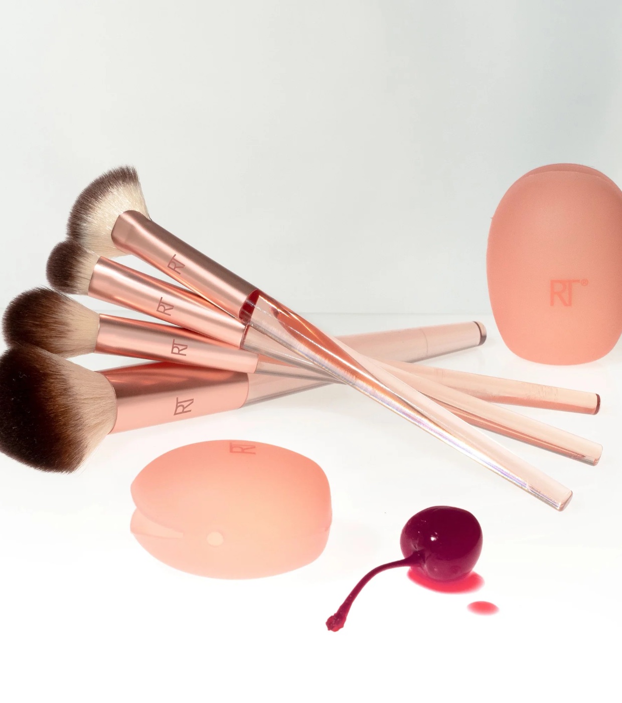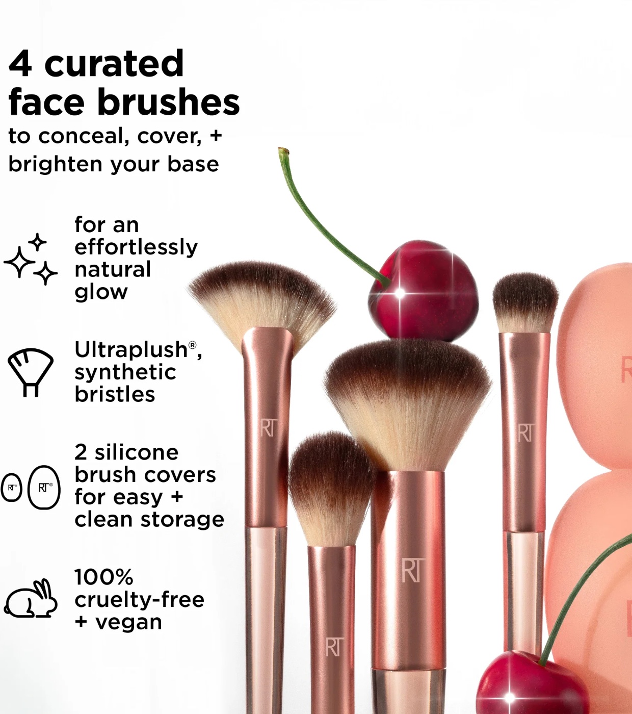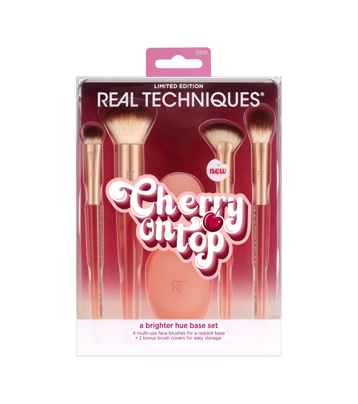 The Real Techniques Cherry On top 4 Brush + 2 Silicone Brush Cap Set is a limited-edition collection that includes 4 multi-purpose makeup brushes to conceal, cover, and highlight your foundation for an effortless, natural-looking glow, plus 2 additional brush head caps for easy (and clean!) storage.