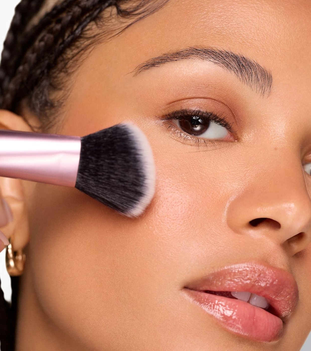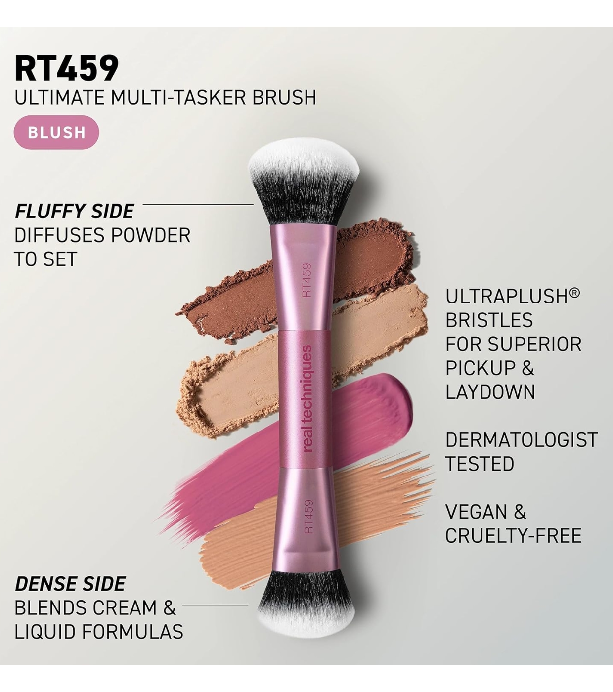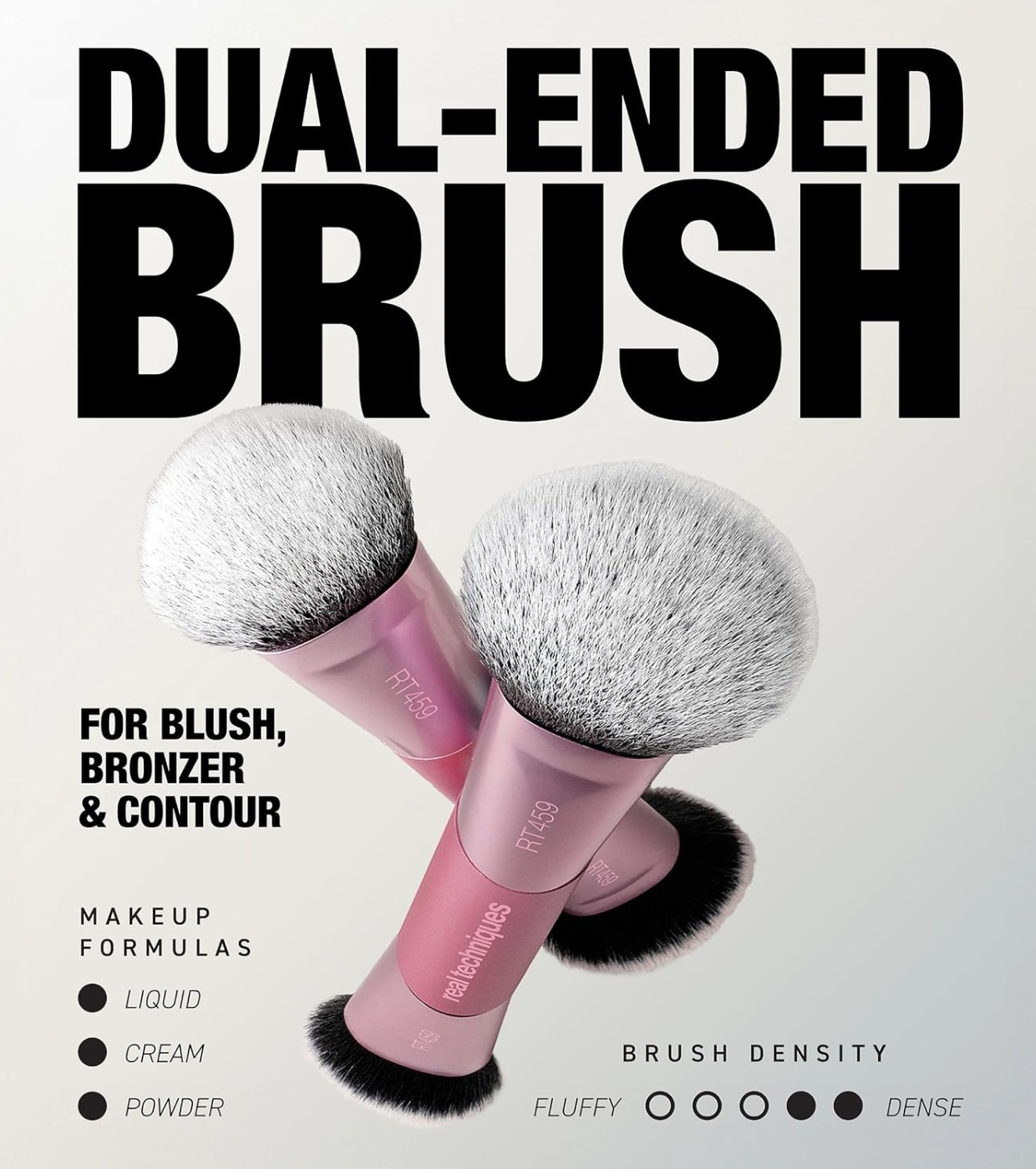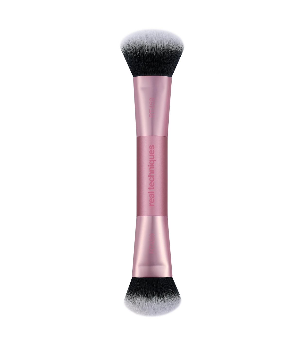 Its design includes two functional sides: one dense and beveled end, ideal for blending cream or liquid products such as foundation, contour or blush, and another looser and fluffier end, perfect for applying and blending powder products with a soft and natural finish.