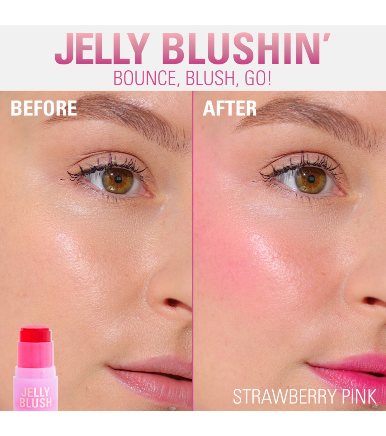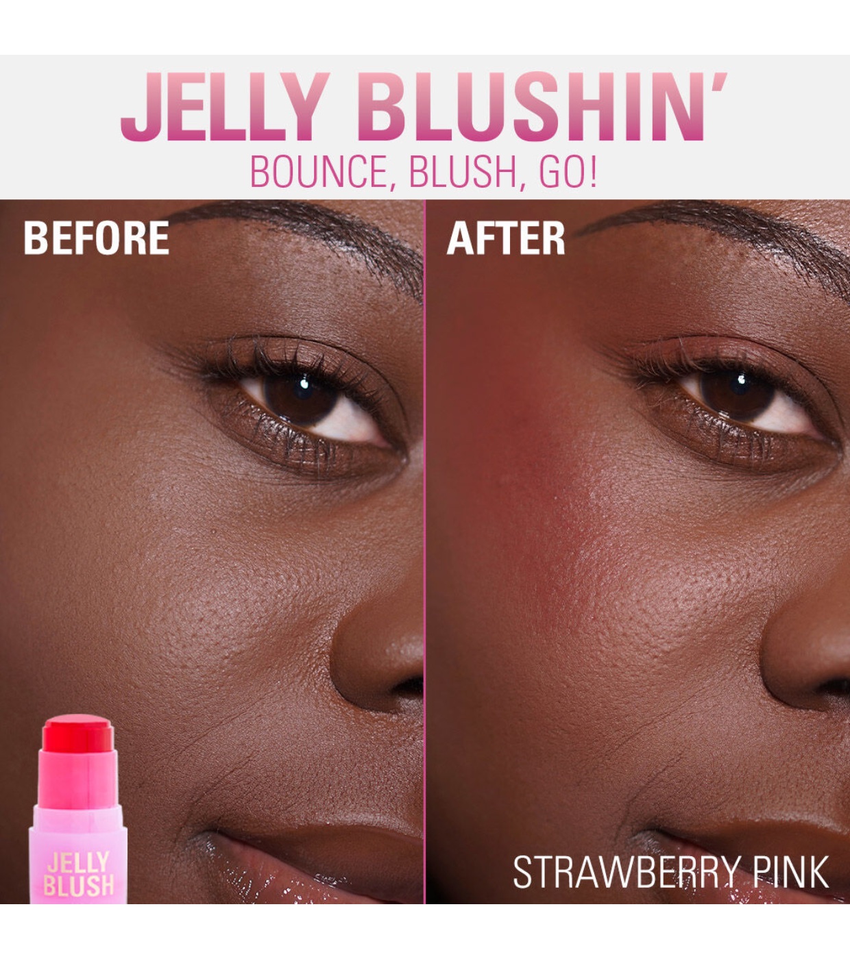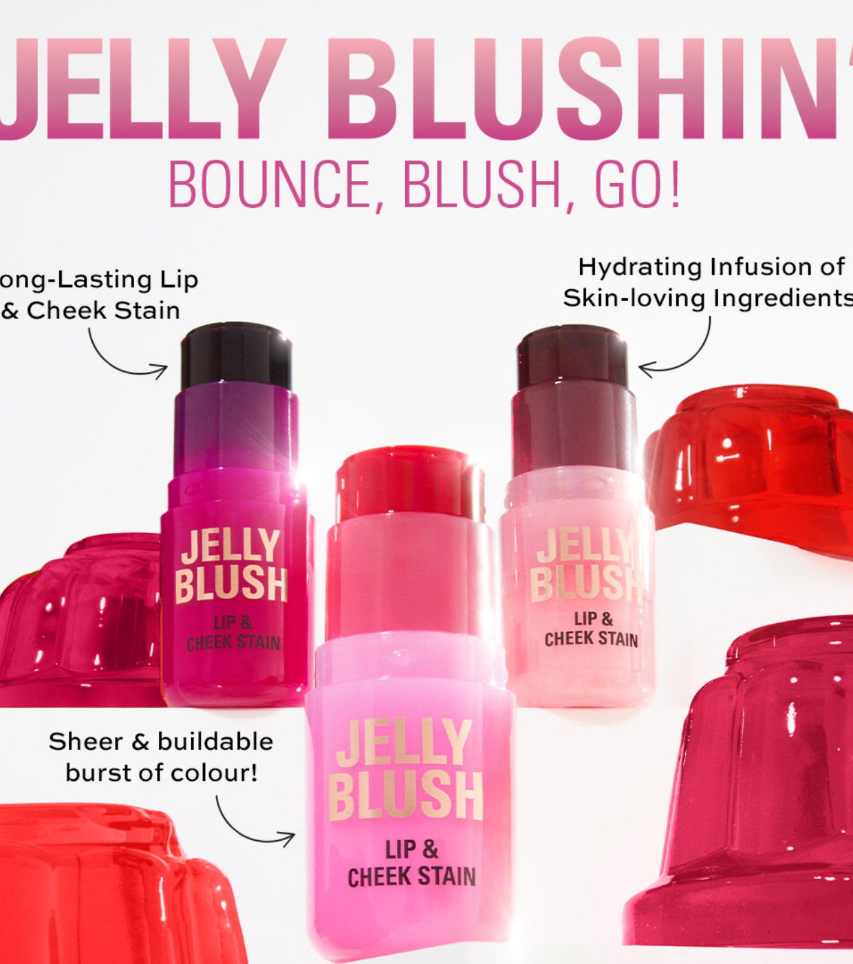 - Bounce, Blush, Go: Long-lasting jelly blush for lips and cheeks.