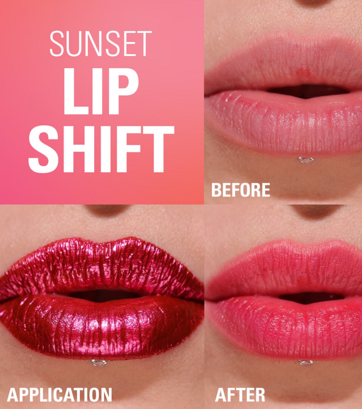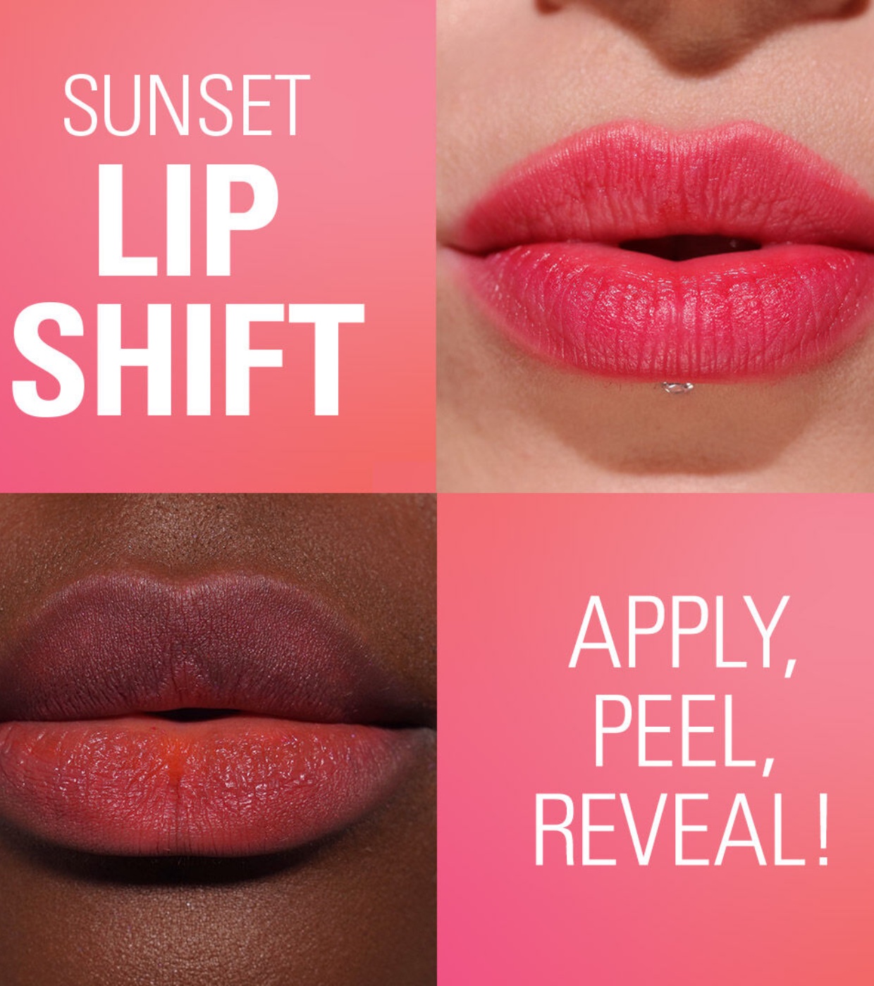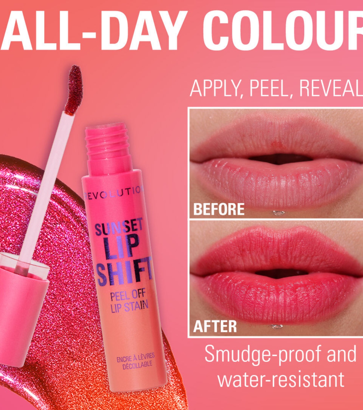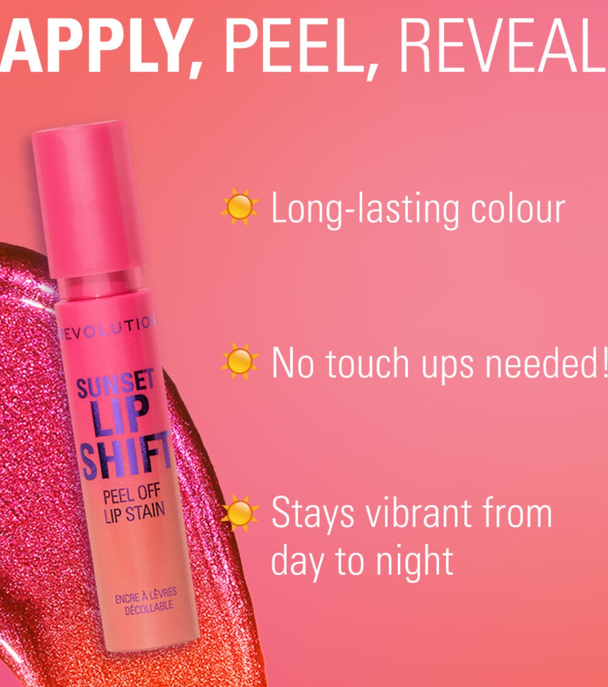 An innovative hydrating pink gloss that dries down to reveal a vibrant, long-lasting coral pink lip stain—an all-day, no-touch-up lip look with Revolution Revolution Lip Stain !