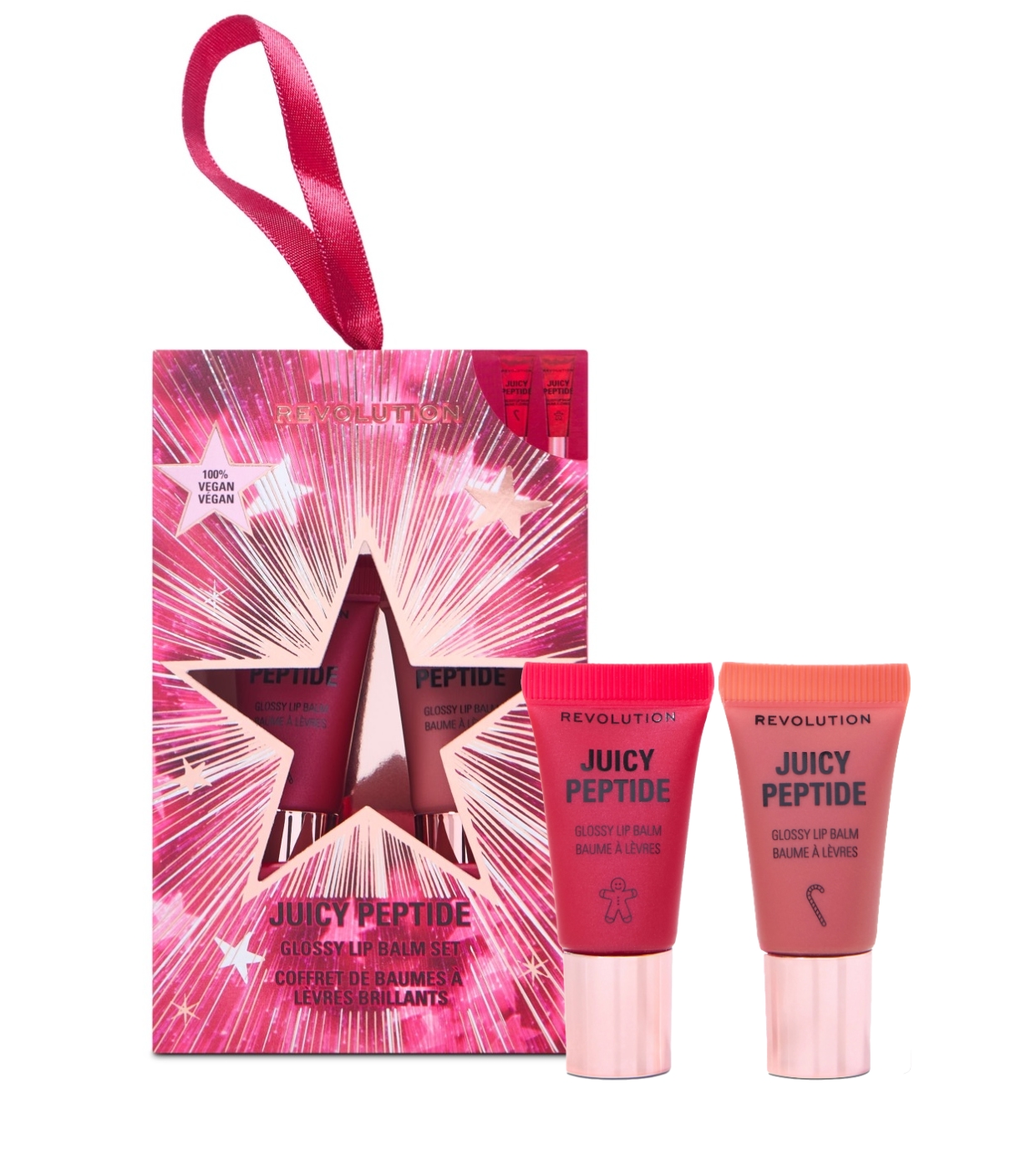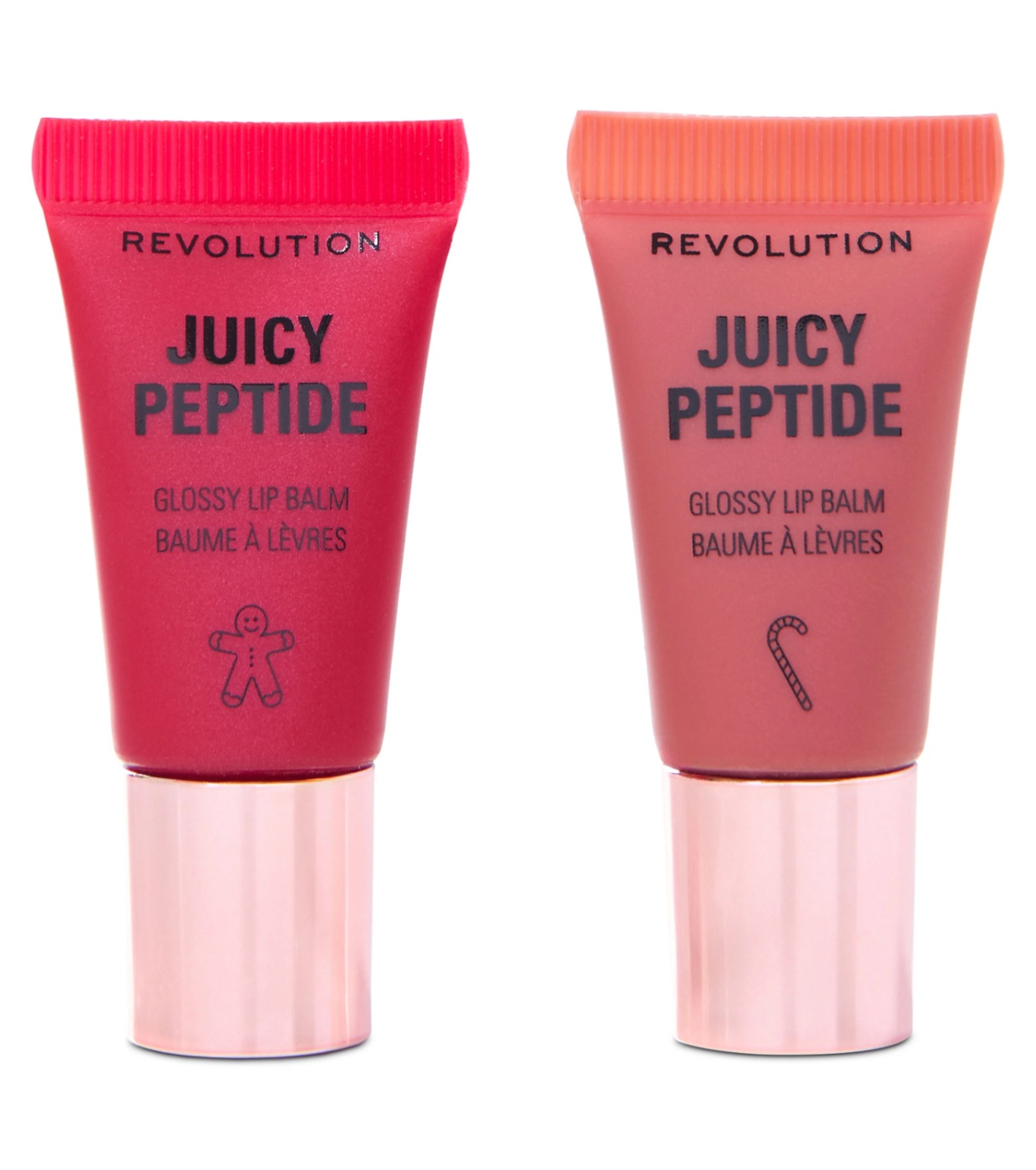 The Revolution Juicy Peptide Mini Lip Balm Gift Set includes two limited-edition festive flavors: Candy Cane and Gingerbread. Packed with peptides, squalene, and vitamin E, each balm delivers intense shine, hydration, and a festive vibe.