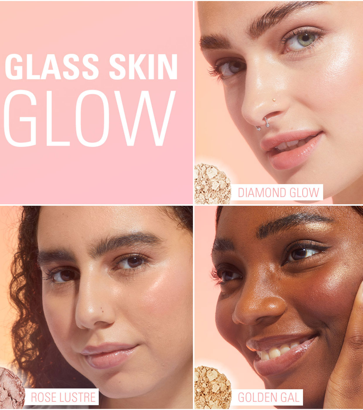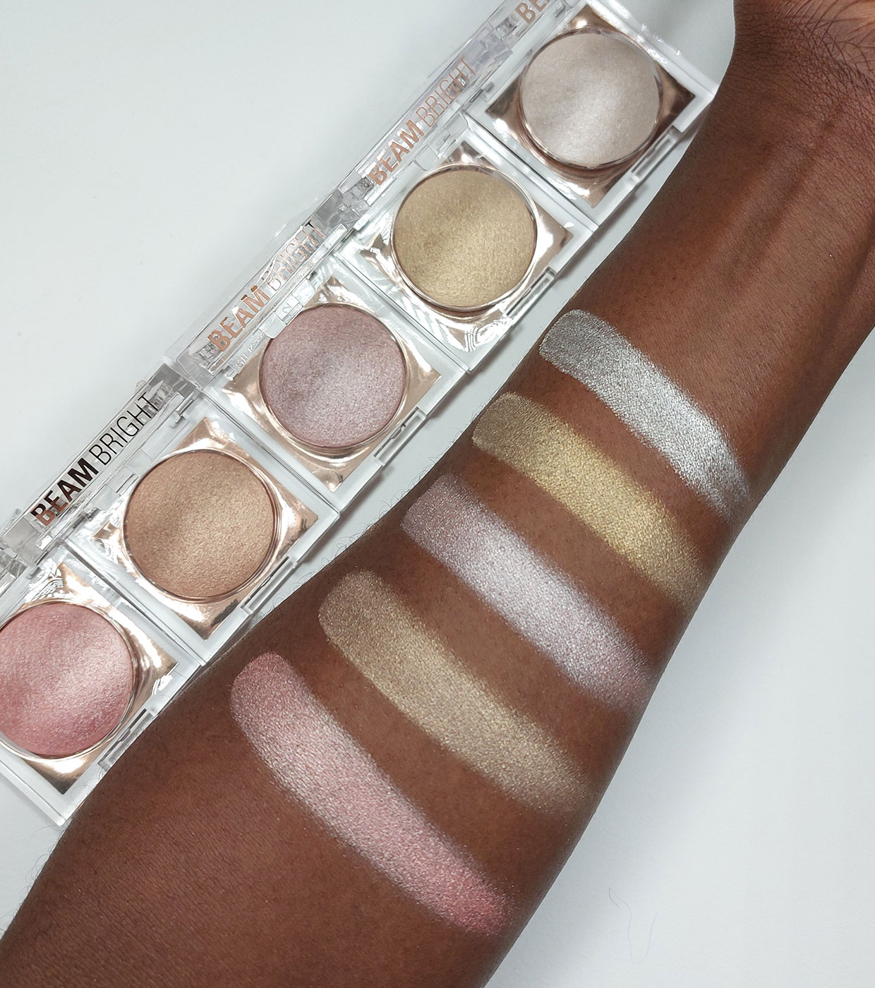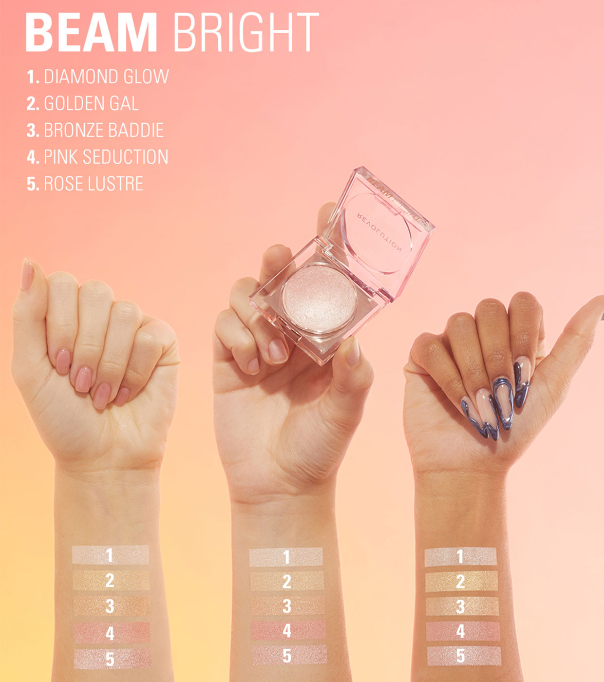 Discover the magic of Revolution Beam Bright: highlighters, a luxurious silky powder that melts into the skin, creating a soft, luminous glow reminiscent of the golden hour.