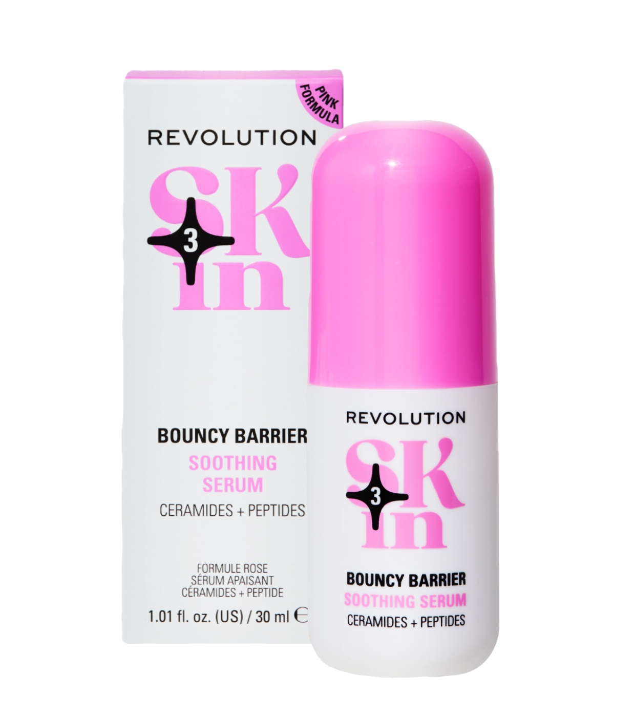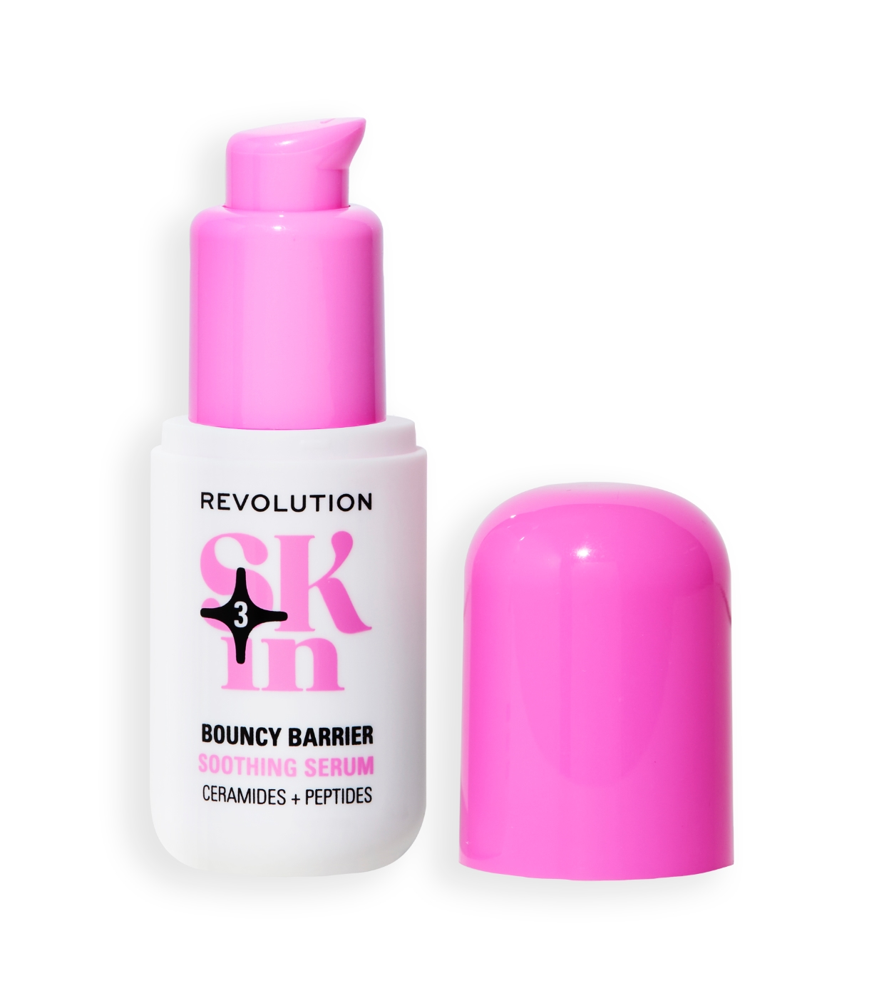 Transform your skincare routine with this calming facial serum Bouncy Barrier from Revolution Skin enriched with pink peptides, designed to calm stressed skin and reinforce the skin barrier.