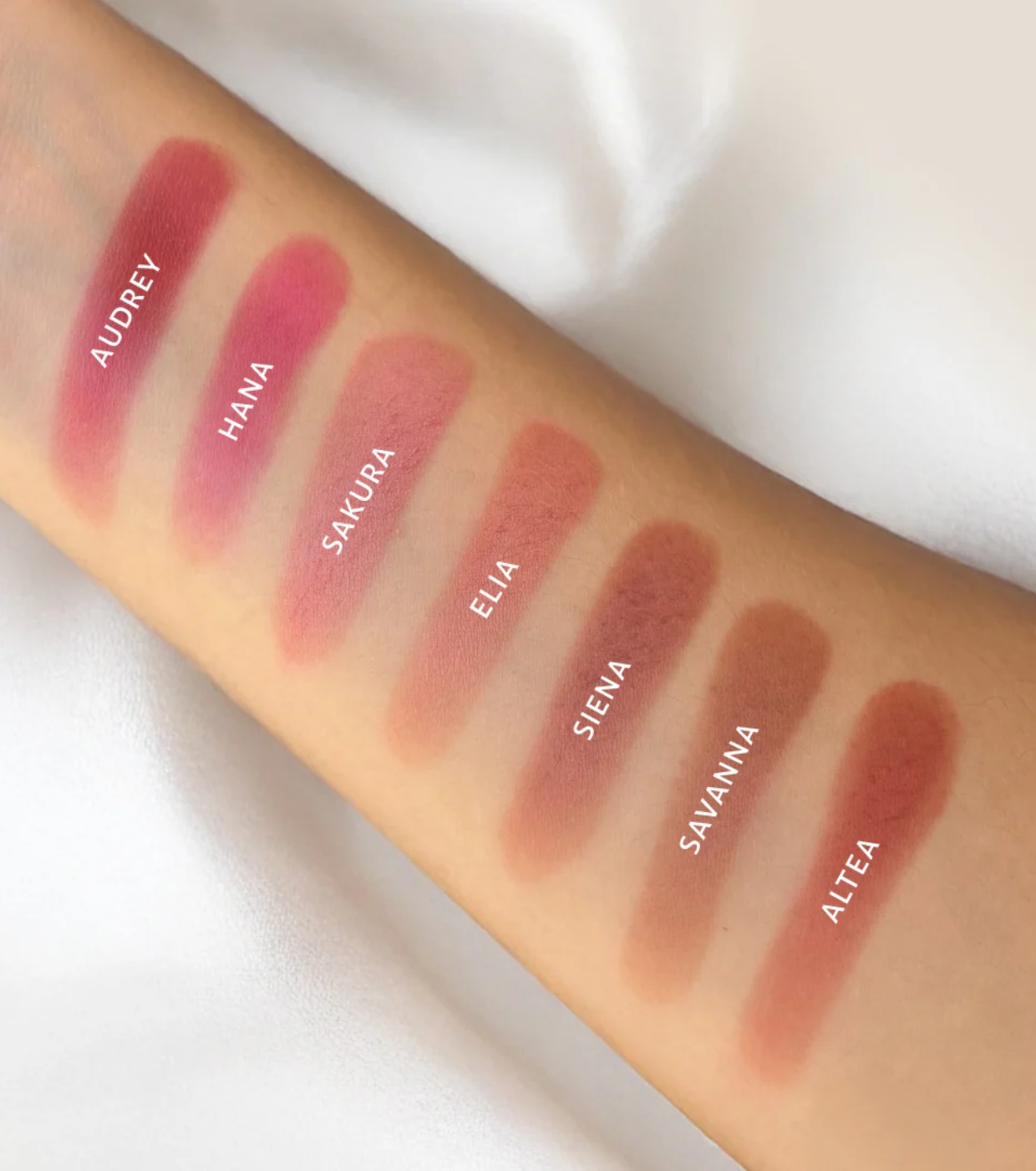 Audrey is a neutral garnet red with subtle warm undertones, now in a silky powder formula that blends seamlessly into skin.